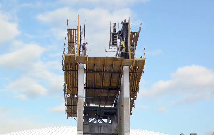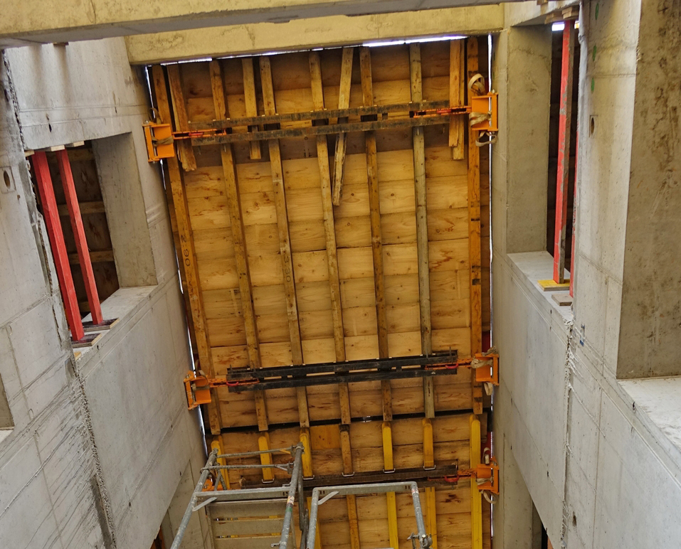 La plataforma para soporte de encofrado en huecos KSP es válida para huecos de ascensor y escalera, columnas huecas u otro tipo de cavidades donde sea preciso apoyar el encofrado. Habitualmente se combina con consolas de trepado convencionales en caras exteriores del muro.