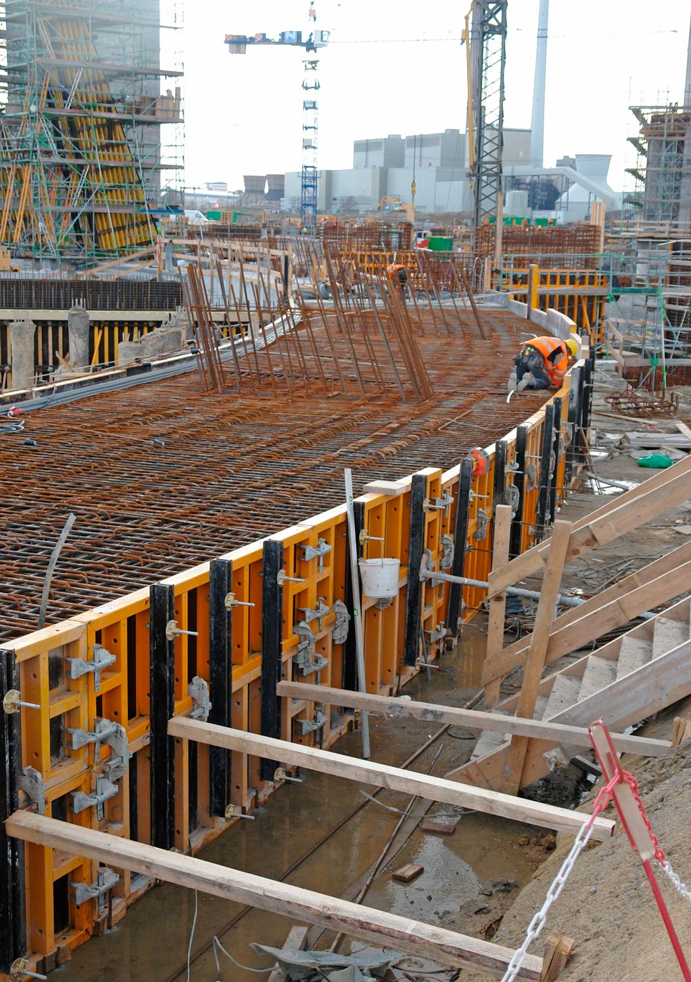 Durante la primera fase se emplearon aproximadamente 30.000 m3 de concreto, con diversos sistemas de encofrado en la ejecución de muros, columnas y losas para la sala de máquinas, la zona de calderas, la torre de enfriamiento y edificios auxiliares.
