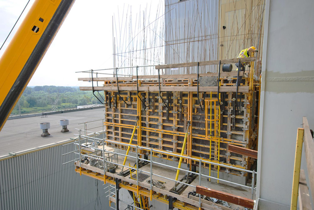 ULMA empleó por primera vez en Polonia el sistema autotrepante ATR, lo que solucionó el escaso espacio de obra y el complejo manejo de grúa para traslado de encofrado. Cada núcleo de ascensores incluye tres caras que suman 6 cilindros hidráulicos. Se realizaron 19 movimientos de encofrado por hueco de ascensor. El sistema ATR permite el trabajo sin grúa y ante un clima adverso. Además, sus amplias plataformas y barandillas garantizan la seguridad del trabajador.
