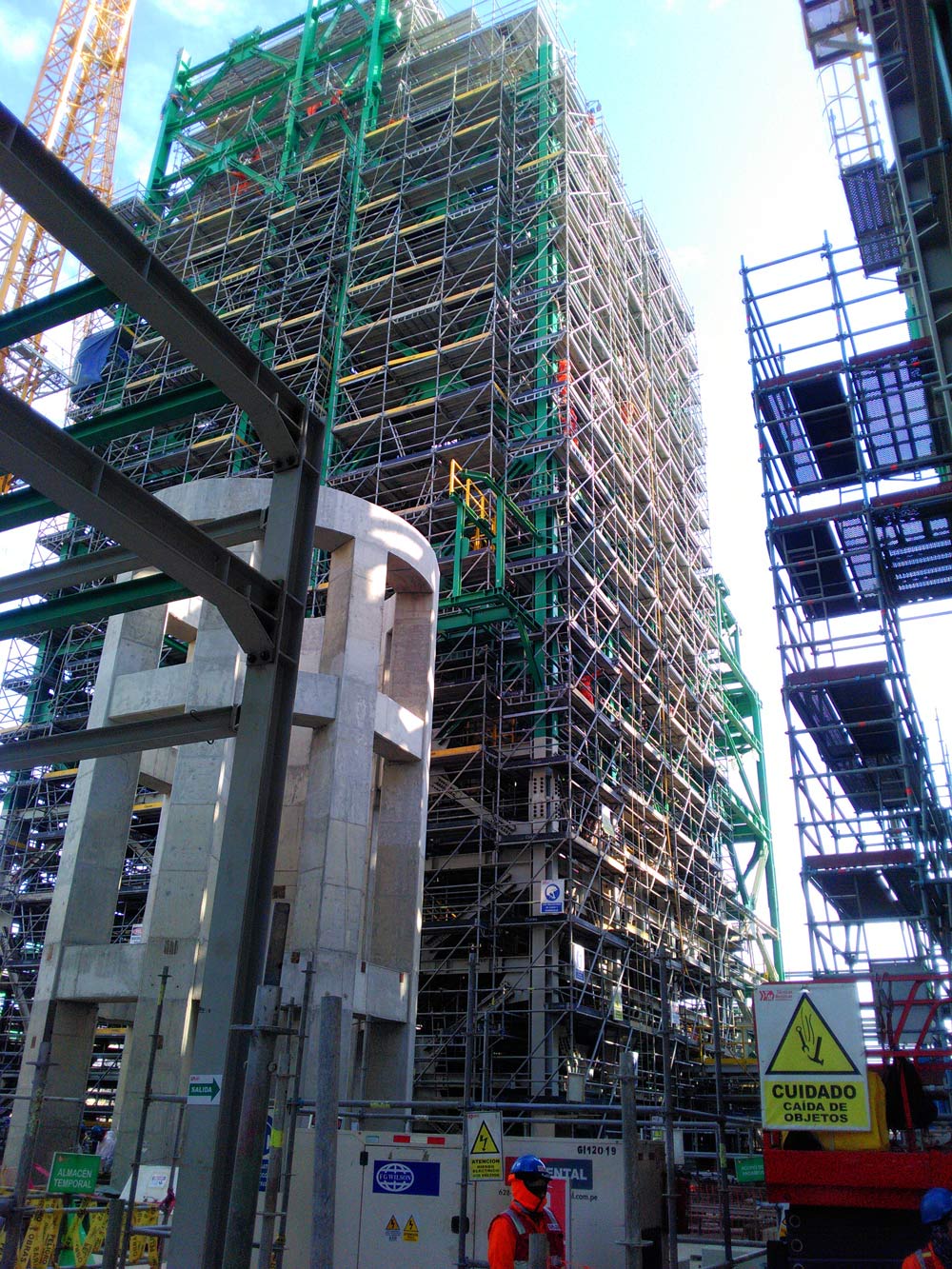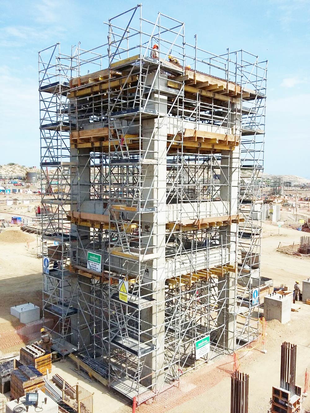El sistema BRIO ha cumplido una doble función, en forma de plataformas de trabajo con soluciones versátiles, y como cimbra ofreciendo un apeo resistente, seguro, y rígido para el concretado de losas y vigas a grandes alturas y con espesores considerables.
