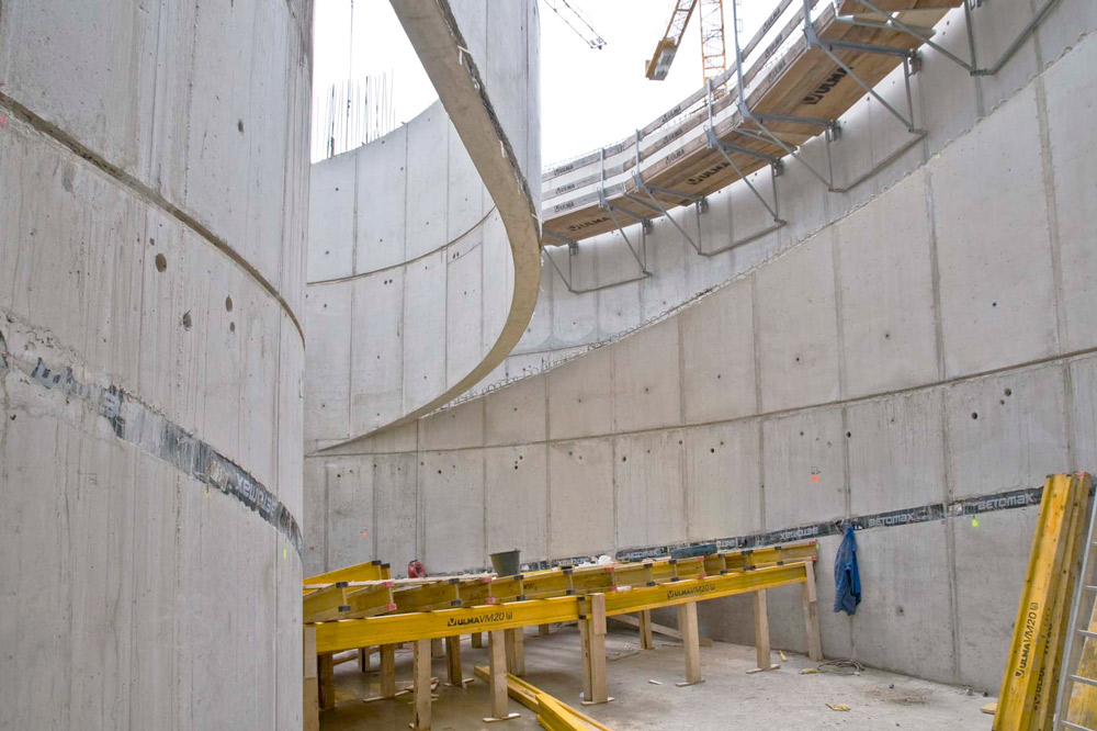 El encofrado vertical ORMA se ajustó con precisión a la ejecución de muros y huecos de escaleras. Su amplia gama de paneles permite la formación y unión sencilla de grandes conjuntos, además de ejecutar esquinas distintas a 90° con pocos accesorios.