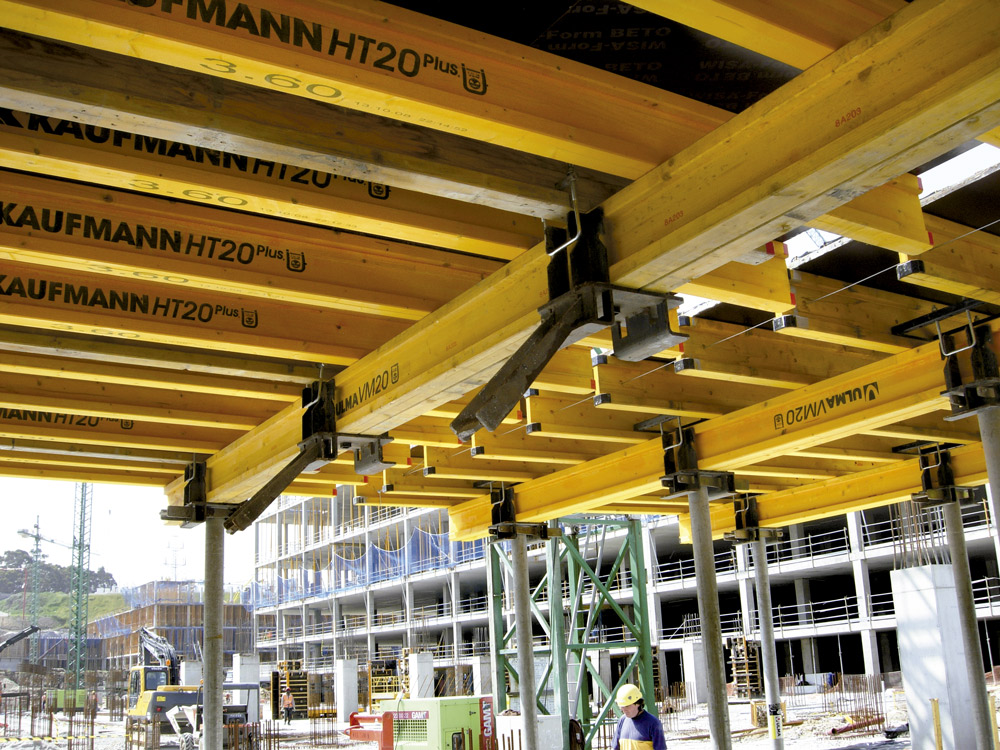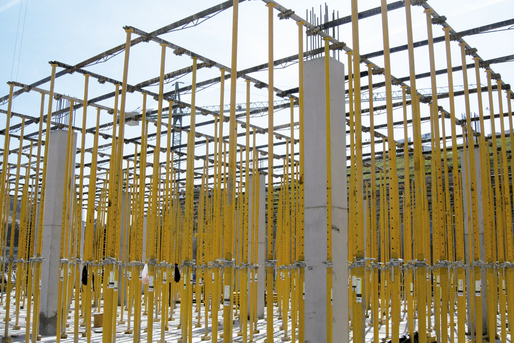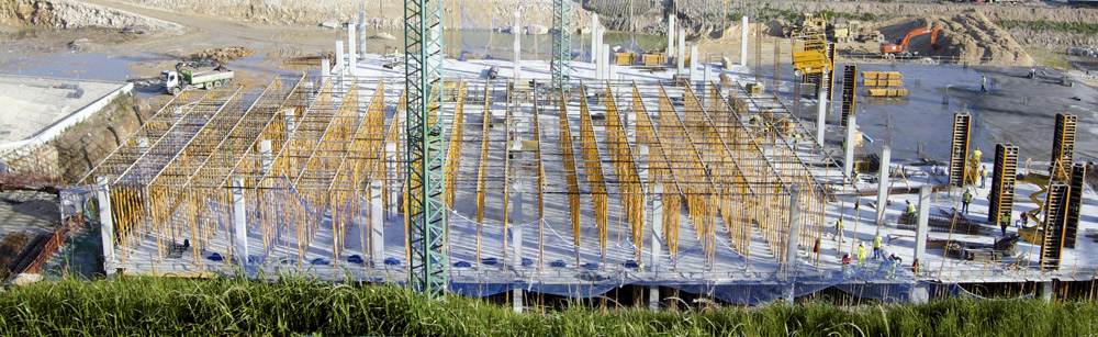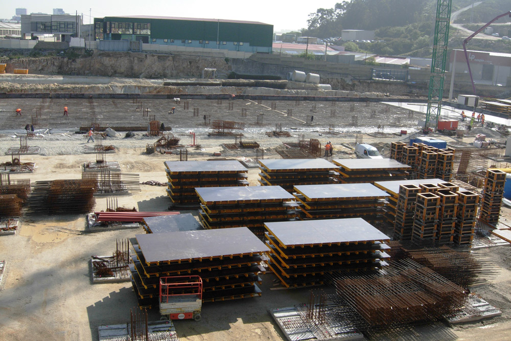 En la ejecución de 450.000 m2 de losa se utilizaron, de acuerdo a las características del proyecto, una combinación entre Mesa VR y Encofrado RAPID sobre cimbra, en alturas considerables, y puntales de aluminio ALUPROP y EP, en alturas intermedias. Estos sistemas aportaron una gran rentabilidad ya que se montaron al inicio de la obra y se trasladaron, sin desmontar, de una zona a otra de la misma. Para el encofrado de los muros y columnas de concreto se utilizó el sistema modular ORMA.
