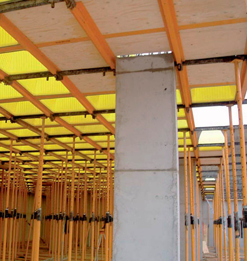 En la ejecución de los más de 26.000 m2 de losas aligeradas del edificio se utilizó el sistema RECUB. El diseño de sus componentes posibilitó que, en menos de 72 horas tras su vaciado de concreto, se pudiera disponer de estos elementos para una nueva puesta. Este producto permite una mayor luz entre columnas, por lo que se reduce su número y aumenta el aprovechamiento del espacio. Además admite una distribución libre y estratégica de las columnas con lo que proporciona una gran flexibilidad para resolver proyectos que requieran espacios diáfanos como este hospital. El apuntalamiento de este encofrado se solucionó con Puntales SP responsables de transmitir las cargas de las losas.