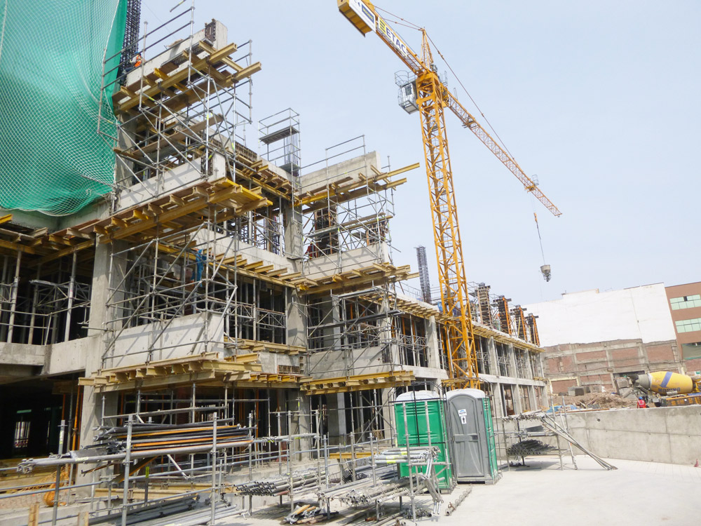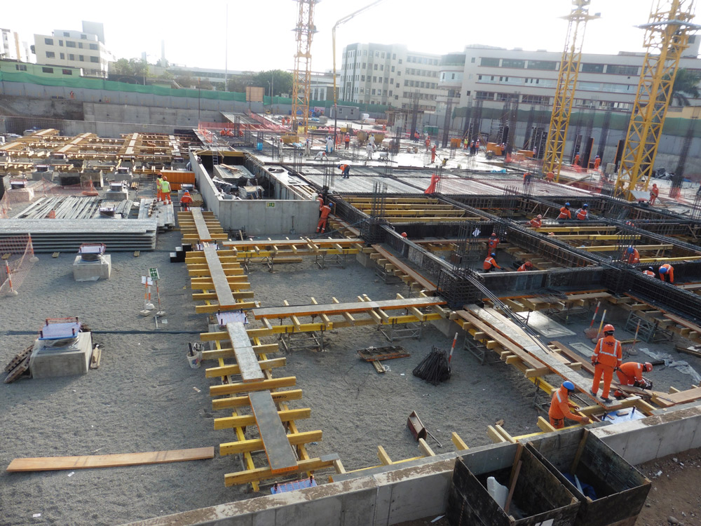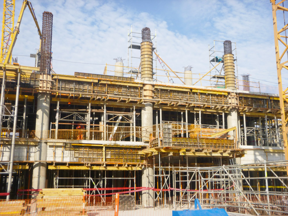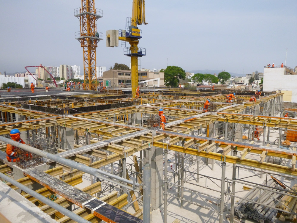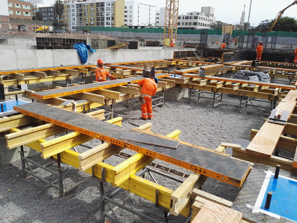 La zona de sótanos fue planteada enteramente con el sistema de encofrado de losa ENKOFLEX sobre puntales ECO y ECO M con vigas, EP C+D30 y C+D40, Puntales SP en losas, mientras que en las rampas se aplicó la Cimbra BRIO.