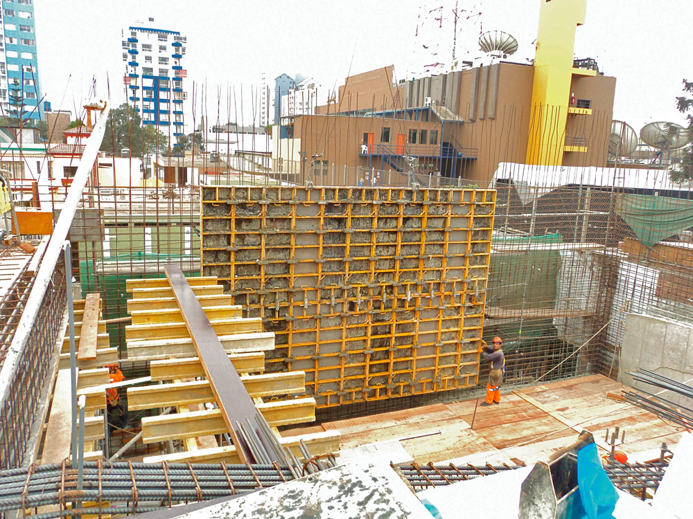 Ante estas premisas, se optó por el encofrado vertical NEVI, de fácil montaje y pocos accesorios. Se montaron grandes paños de 8 x 4 m fácilmente transportables con grúa.