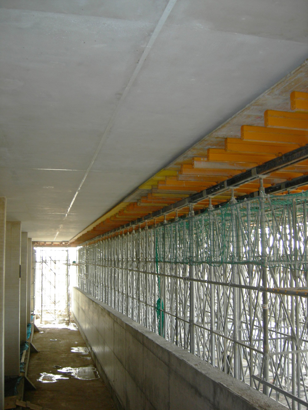 En la ejecución de las losas, de configuración simple, se utilizaron los Encofrados Horizontales RAPID y RECUB, mientras que el Encofrado ENKOFORM HMK se aplicó en aquellas superficies más complejas, por su geometría o espesor. La cimbra sirvió como estructura de base a los encofrados de losa.