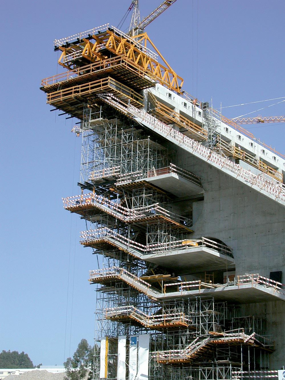 A 30 m de altura, los muros en su parte frontal presentan un voladizo de 13 m resuelto con el mencionado sistema, así como los tapes dorsales con Consola G, debido al ataluzado del muro. El Encofrado ENKOFORM V-100 demostró su versatilidad y eficacia en la solución de las múltiples geometrías de esta obra.