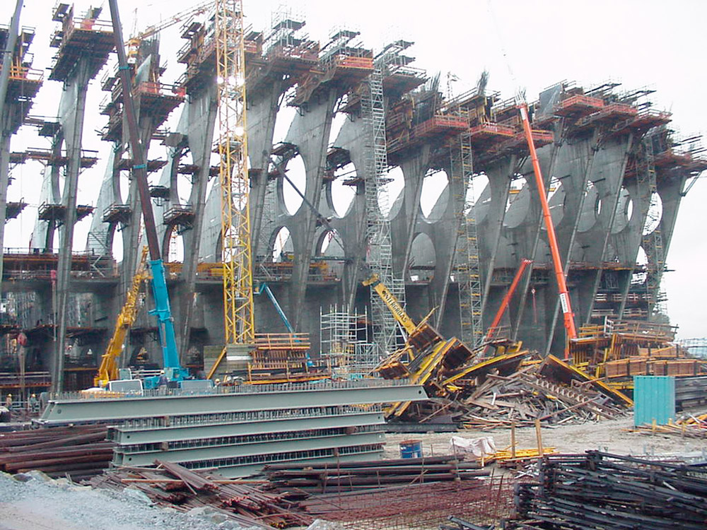 El voladizo de 6 m, en cada extremo, se realizó con ENKOFORM HMK suspendido de 4 cerchas. Como plataformas se emplearon las cimbras que actuaron de soporte al encofrado de losas en voladizo. De esta manera, se optimizó el uso de material al reutilizarse de manera continuada.