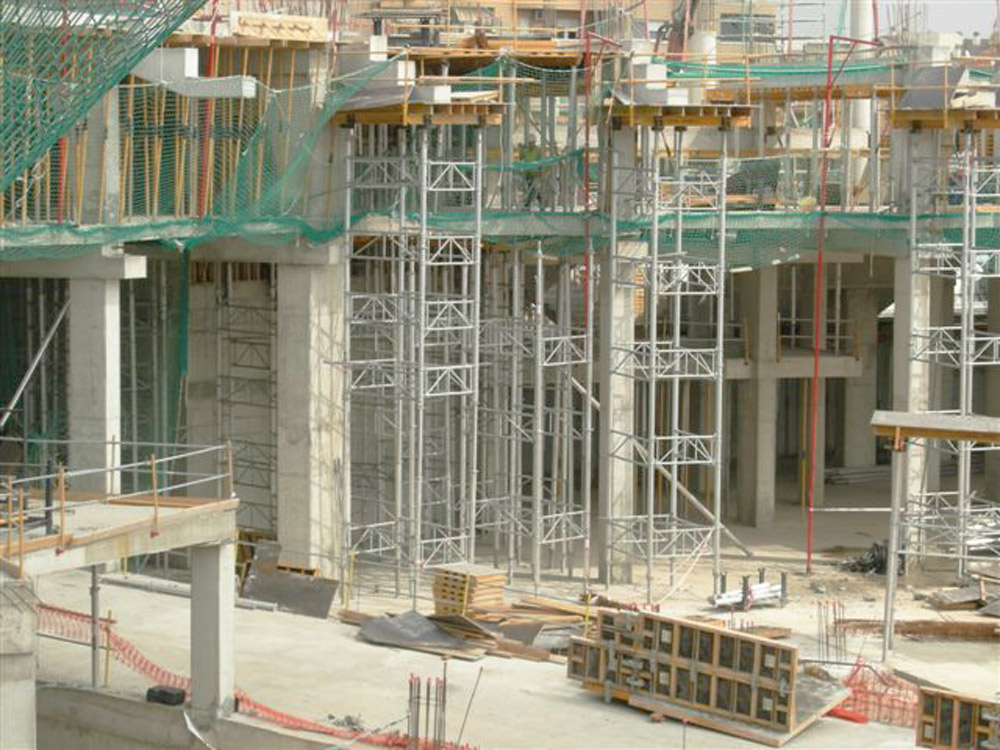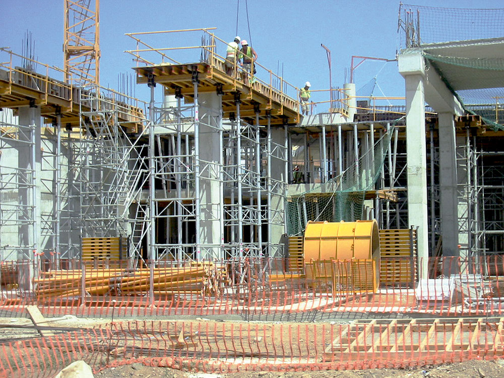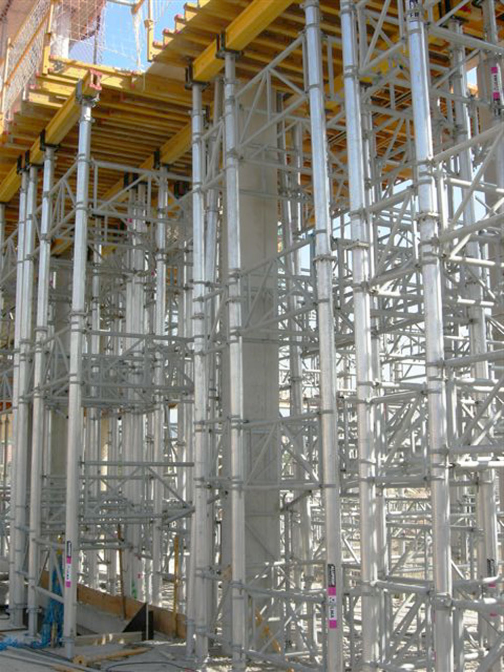 Con el Encofrado CC-4, se ejecutaron in situ las losas de concreto y como apuntalado, puntales de aluminio ALUPROP arriostrados formando torres de fácil manipulado. Así, se alcanzó con seguridad las alturas necesarias en el apuntalamiento de la parte superior de las gradas.