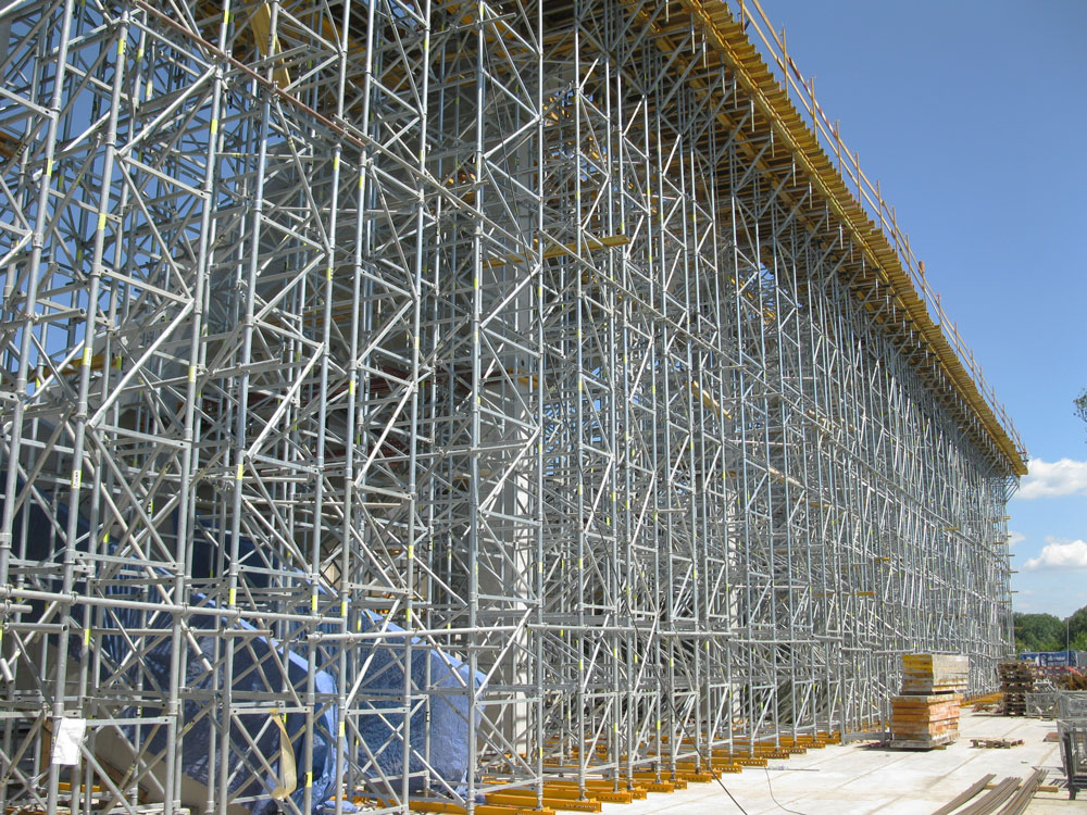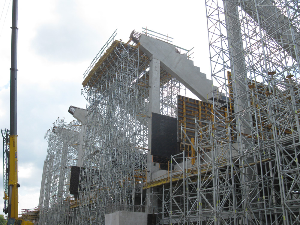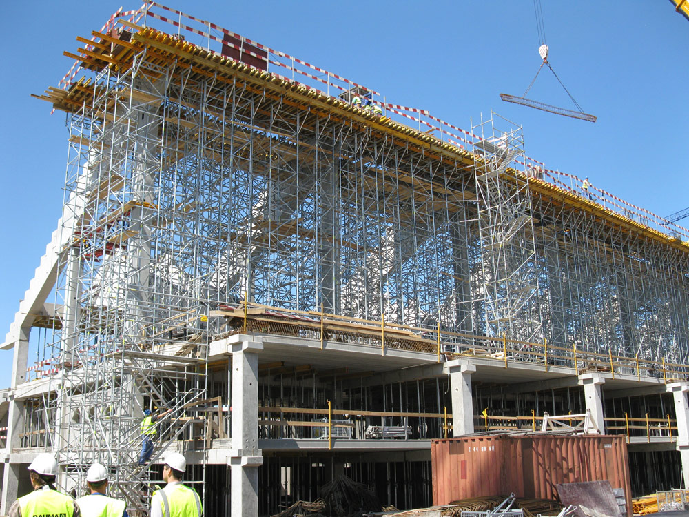 Las obras se iniciaron de forma simultánea en tres de las cuatro gradas (norte, sur y este). Las zapatas, los cantos de losa, muros y huecos de ascensor se ejecutaron con el eficaz sistema de Encofrado Vertical NEVI. Debido a los altos requerimientos arquitectónicos exigidos, se ejecutaron columnas de 60 x 80 cm con el sistema modular ORMA que permitió alcanzar una dimensión de columna de 115 x 115 cm con los mismos paneles. Ambos sistemas modulares demostraron su rentabilidad ya que sus paneles pueden unirse con un mínimo de piezas.