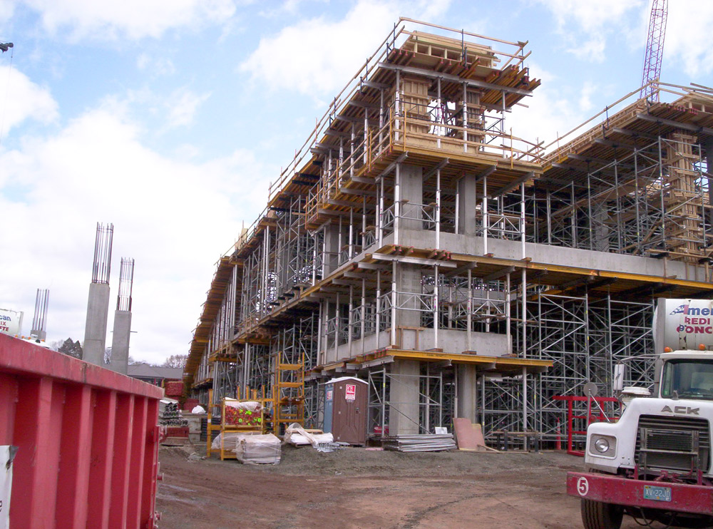 Tras las primeras puestas de material en muros y pilares, se realizaron las losas a base de vigas macizas. Como sistema de carga y apuntalamiento se utilizó una combinación entre T-60 y torres de puntales de aluminio ALUPROP arriostrados, según zonas. De hecho más de 7.000 m2 de T-60 se instalaron en obra.