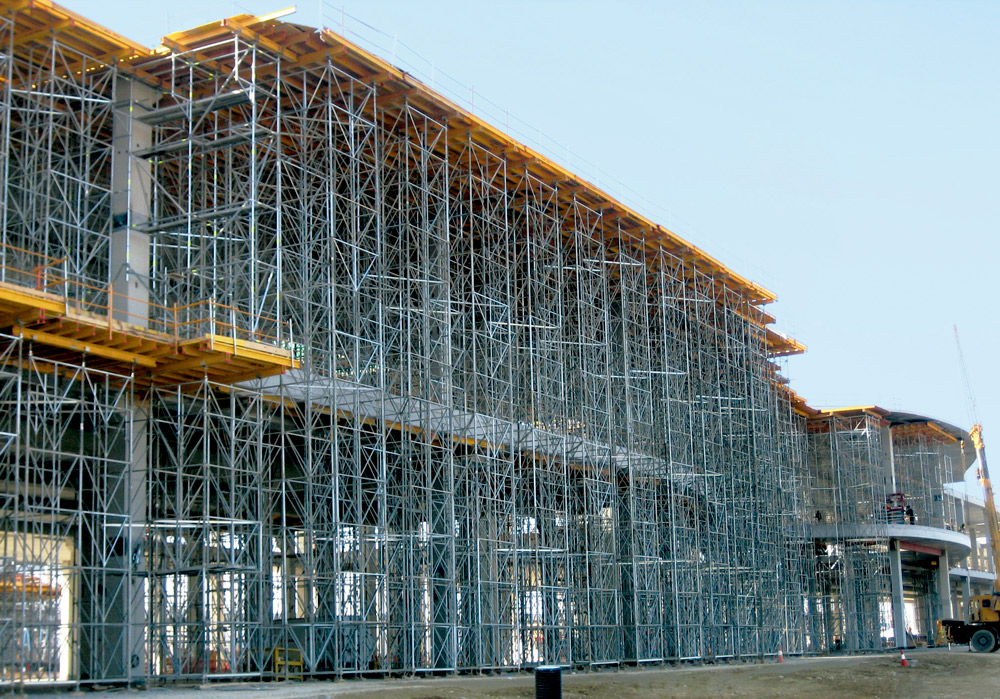 Los altos ritmos de ejecución y los exigentes plazos de entrega provocaron la realización de trabajos en paralelo. Mientras se ejecutaban los últimos cometidos en altura, el montaje de la estructura metálica, en la parte inferior se instalaron las cristaleras de la fachada. Para evitar la caída de cualquier tipo de material, se elaboró una visera de protección mediante el sistema BRIO, un andamio seguro y polivalente, capaz de soportar desde los apuntalamientos más ligeros hasta los más pesados. De esta manera, fue posible trabajar a cualquier altura con todas las medidas de seguridad garantizadas.