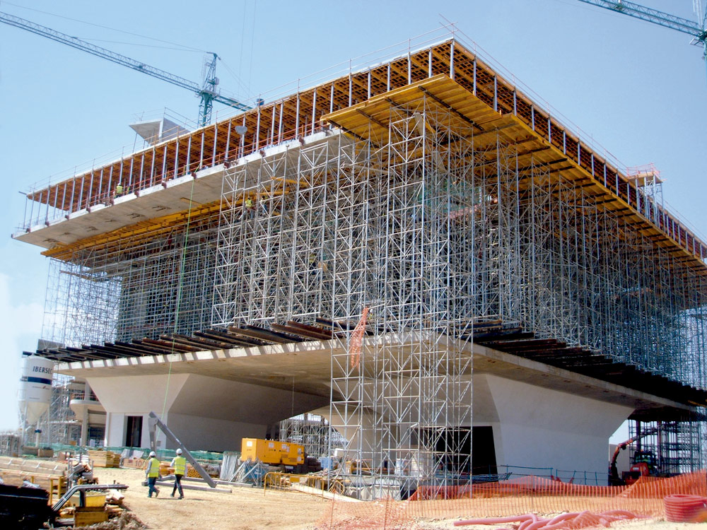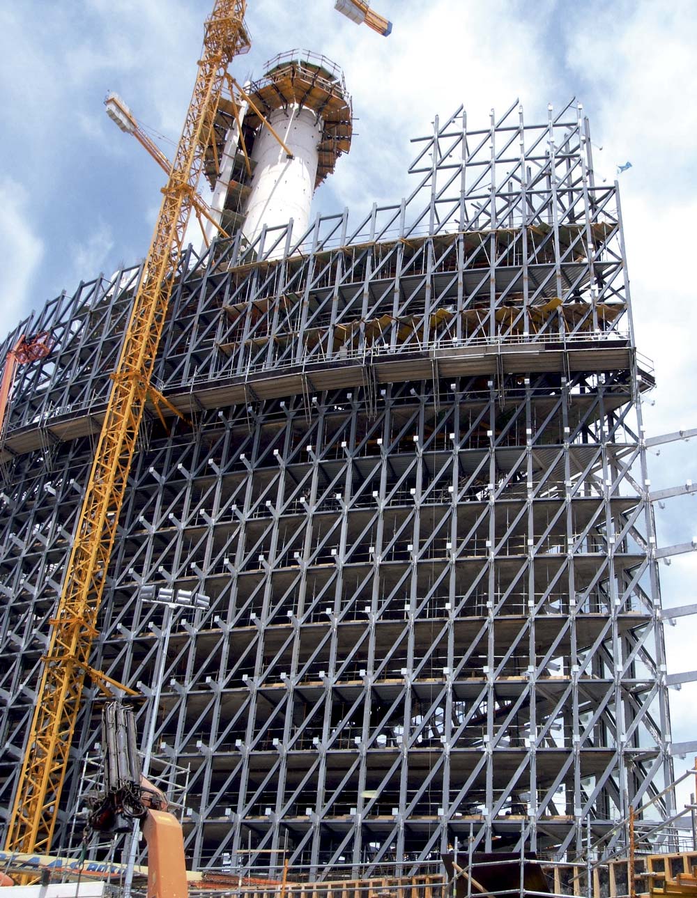 La columna vertebral del proyecto consta de dos núcleos, separados 20 m entre sí, que permiten sostener los 8.000 m2 de fachada de cristal. Un edificio tan peculiar requirió de soluciones particulares. Así, las complejas formas redondeadas se consiguieron mediante el empleo de encofrados realizados para esa obra. Estos productos se utilizaron sobre sistemas de trepa para, de esta forma, alcanzar los 70 m. Los trabajos de altura necesitaron pequeños forjados intermedios llevados a cabo con cimbras y Andamio Multidireccional BRIO, además de una seguridad extrema que se mantuvo durante toda la obra.