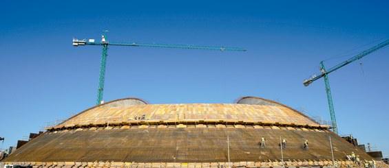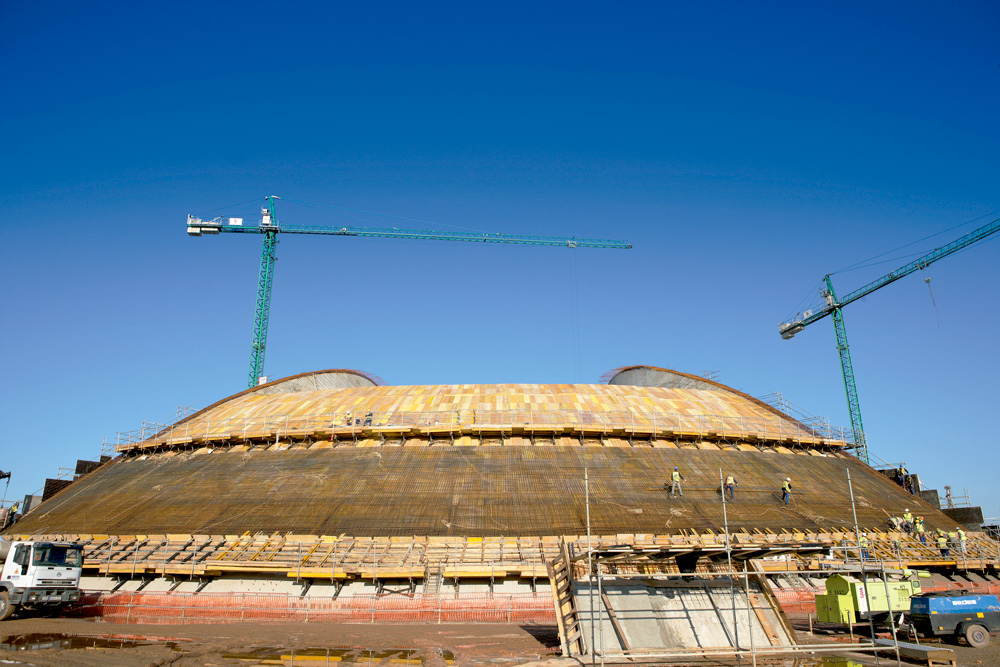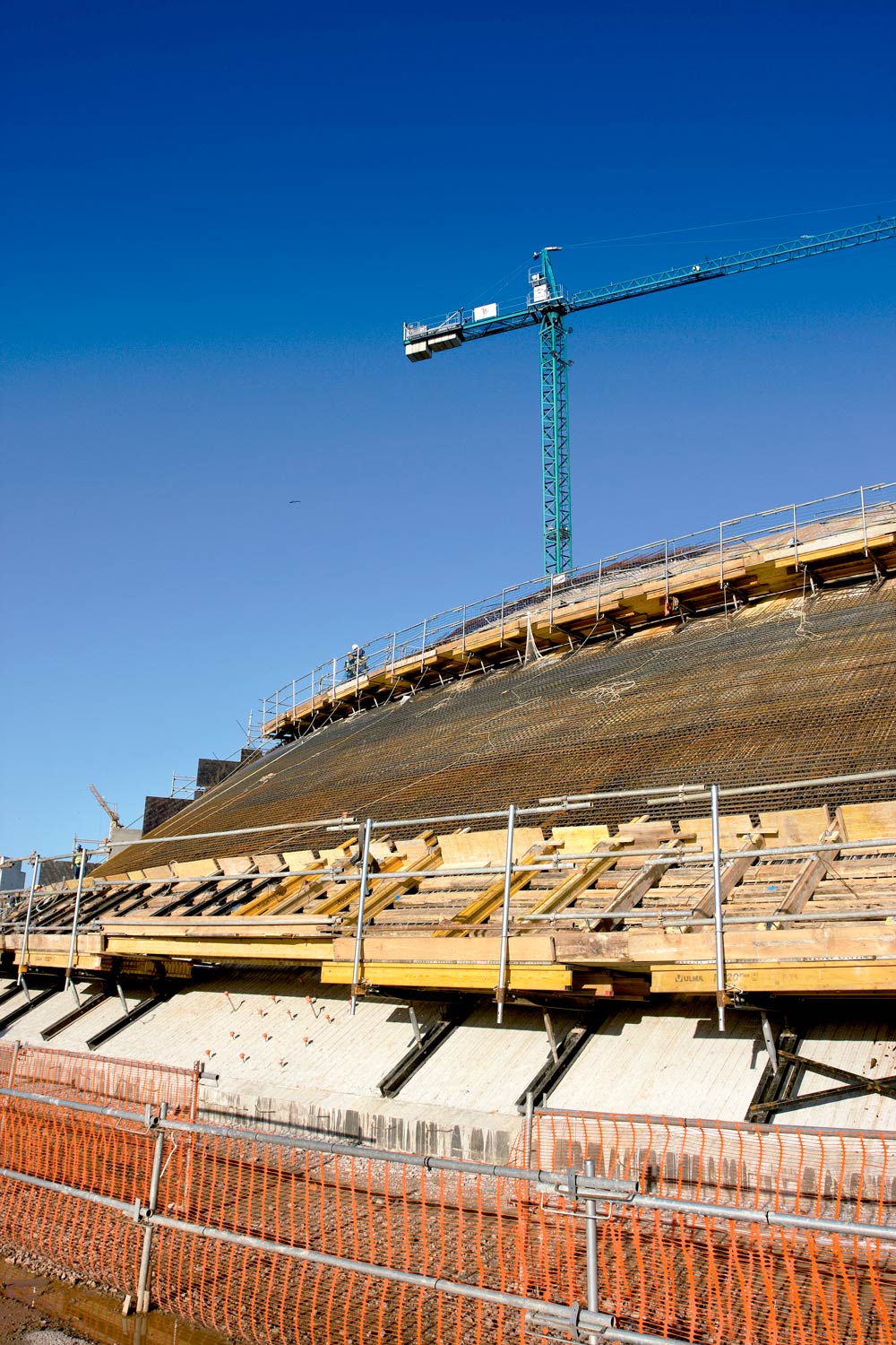 Para los trabajos en la cubierta, teniendo en cuenta su especial geometría, las alturas requeridas, así como el cambio de espesor en la losa a partir de la zona de escenario, se optó por el sistema de T-60 que proporcionó la flexibilidad en una obra de este tipo. Además, demostró su capacidad de adaptación a cualquier forma mediante la distribución de torres individuales o agrupadas y su gran capacidad de carga como sistema de apuntalamieto.