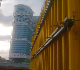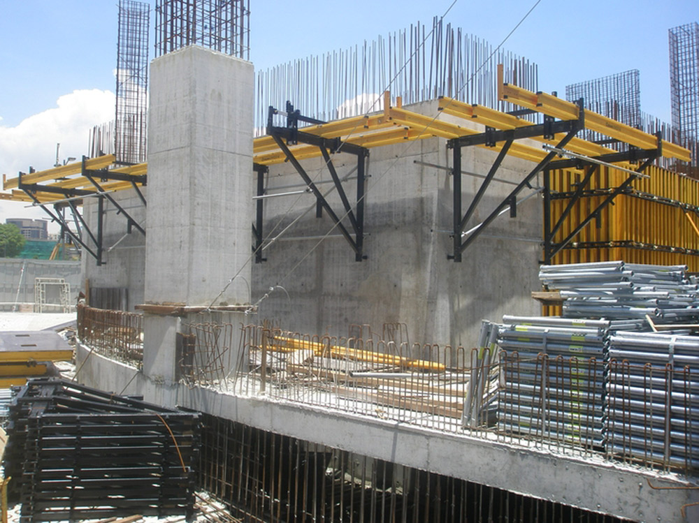 Al tratarse de una geometría de obra un tanto compleja, los muros y columnas se ejecutaron con el Encofrado Vertical ENKOFORM VMK y Consolas de trepado CM-220. Este sistema de riostras está formado por elementos estándares, principalmente por riostras metálicas y vigas de madera que soportan el tablero, conformando paneles a medida en función de las características requeridas.