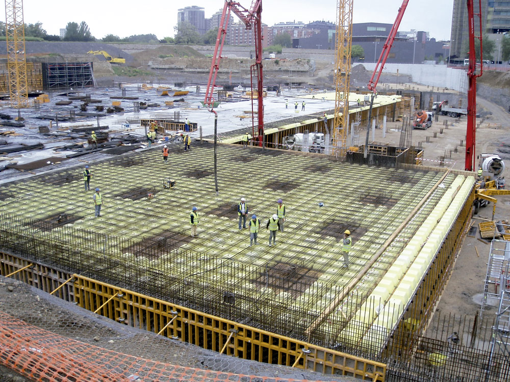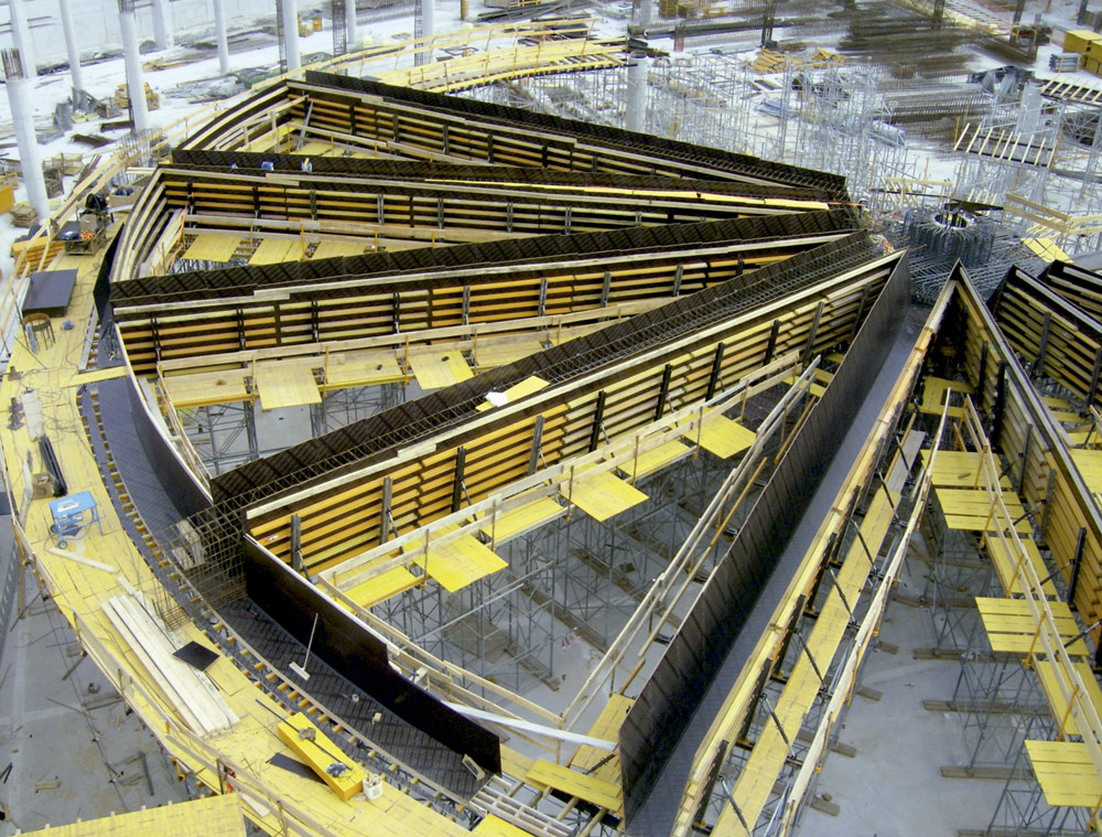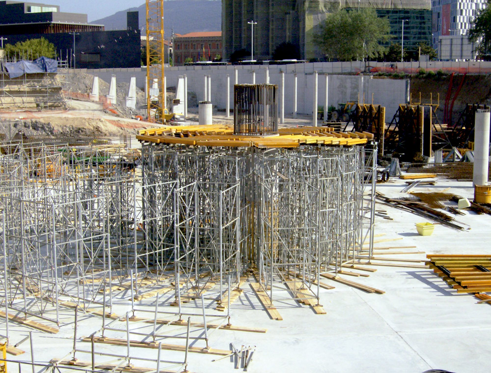 En la ejecución del núcleo central del edificio se empleó como encofrado de las vigas ENKOFORM HMK y como apuntalamiento, una cimbra modulada de manera que se adaptó a la geometría radial.