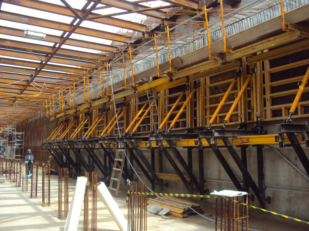 Los muros laterales a una cara de 5,7 m se han realizado con Encofrado Modular ORMA y cerchas que se han trasladado con carros de una puesta a otra sin la necesidad de ser desmontadas. Por razones de ejecución, se han llevado a cabo en dos fases, la primera con cerchas SMK y la segunda con consolas de trepado a una cara SBF.