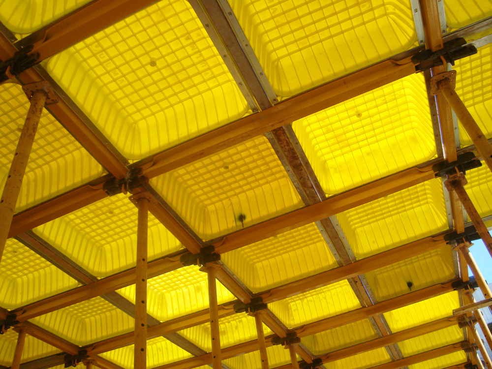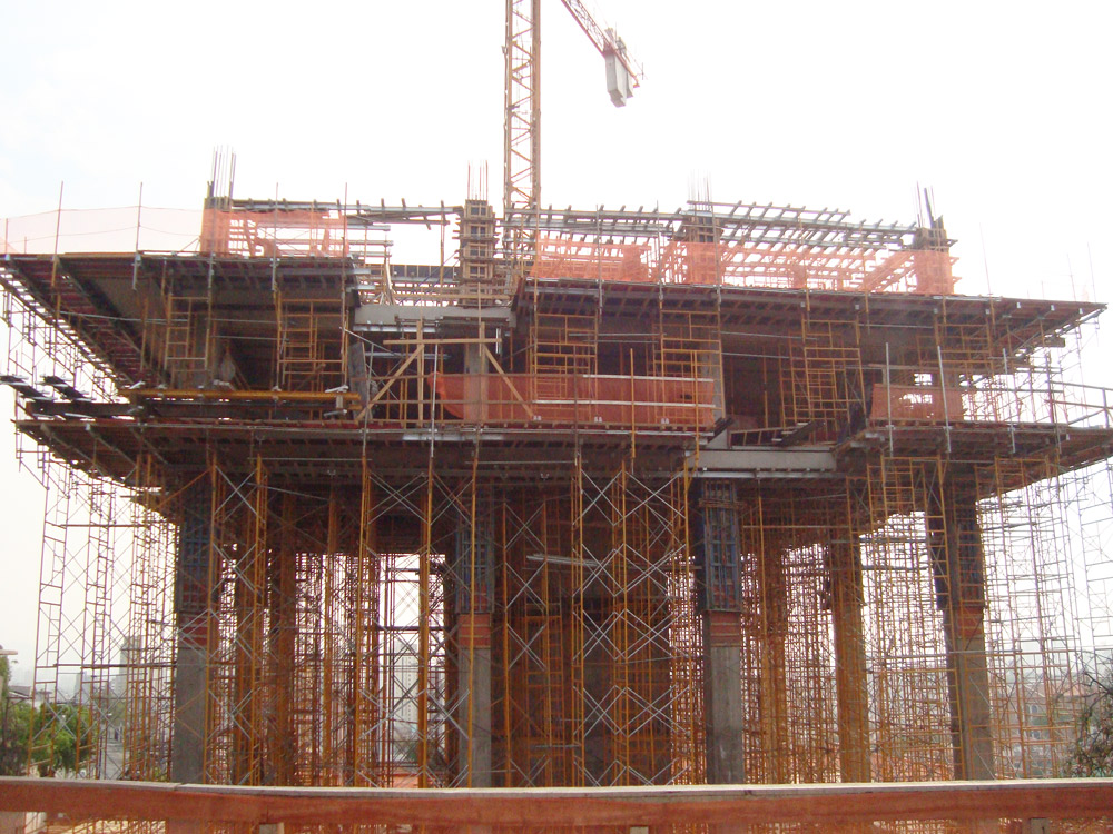 En alturas bajas, las estructuras horizontales se apuntalaron con Puntales SP. En zona perimetral y alturas superiores a la de puntal, se utilizó Cimbra G. La geometría cambiante del edificio exigió el cubrimiento de voladizos con vigas y perfiles metálicos en posiciones variables en cada piso.