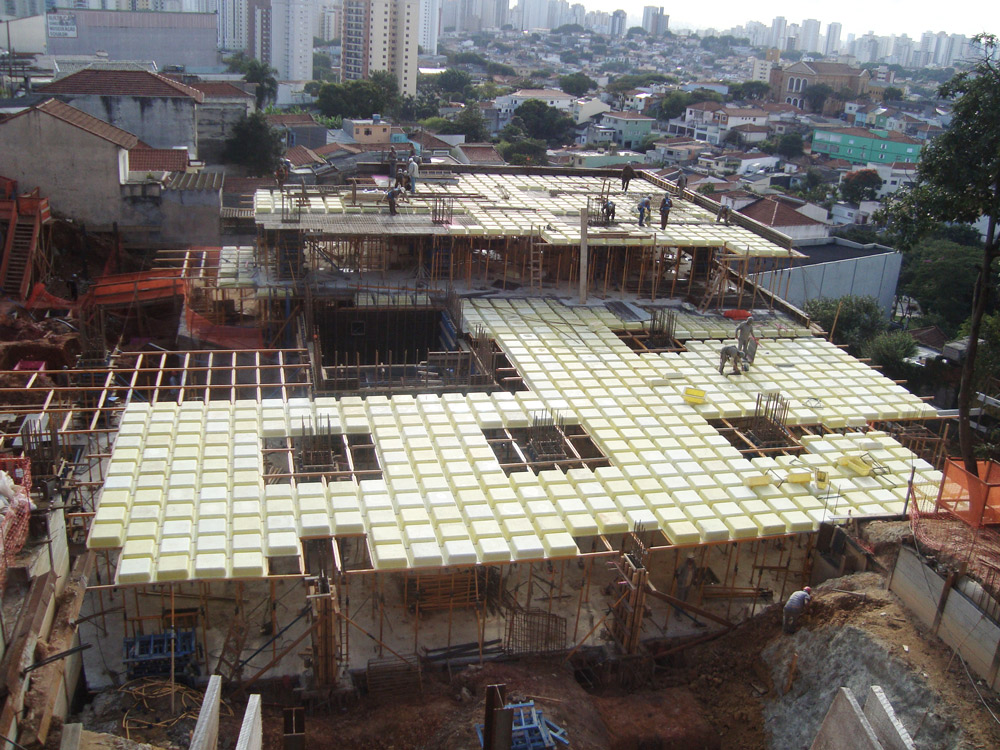 Las losas de los cuatro sótanos (más de 6.0002) se ejecutaron de forma rápida y segura con el sistema recuperable para losas nervadas RECUB, con cubeta de 20 cm y 5 cm de capa de compresión. En losas convencionales, se empleó el encofrado BTM, con ciclos de vaciado de concreto semanales.