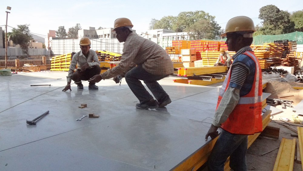 El núcleo central fue construyéndose en todo momento uno o dos niveles por encima de las losas. El encofrado ENKOFORM VMK se combinó con el sistema de trepado BMK en la cara exterior de los muros y plataformas interiores KSP en las caras internas. El ciclo de vaciado de concreto por planta se calculó en 9 días.