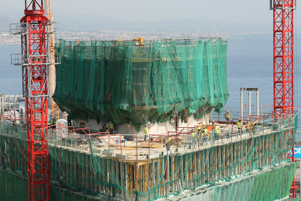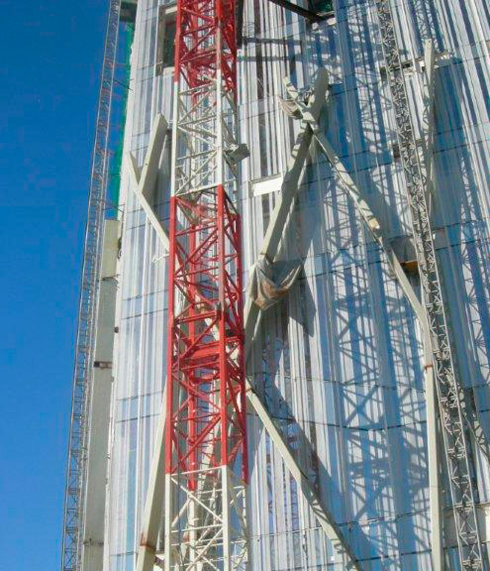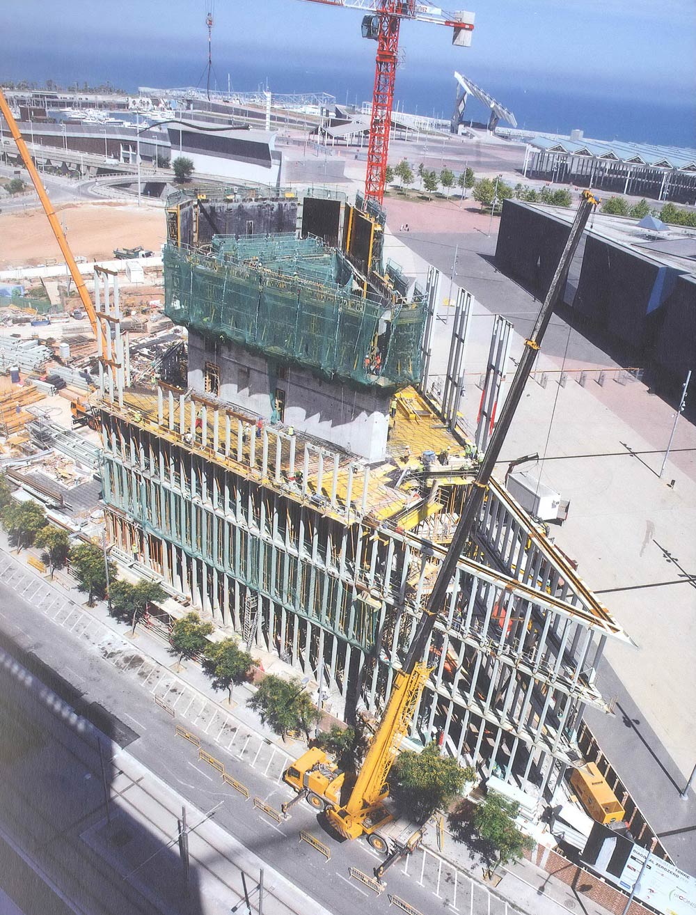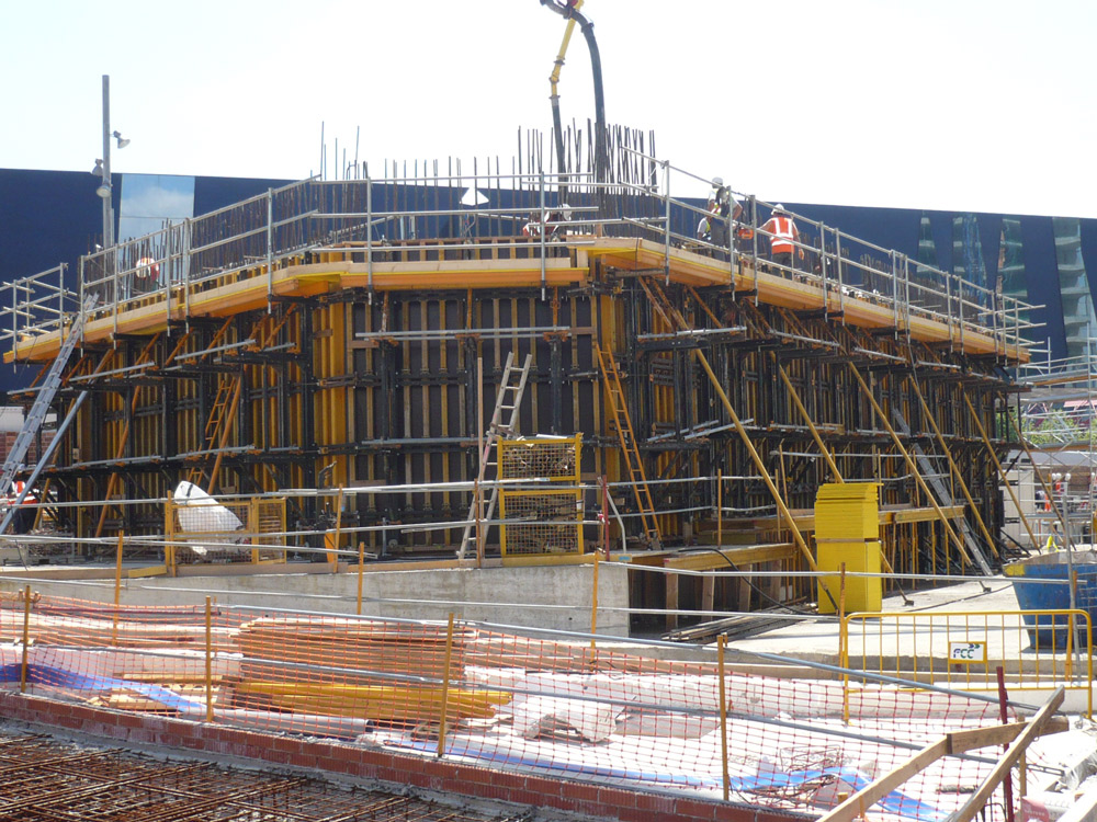 Para evitar agujeros en el concreto, se realizaron etapas de vaciado de muro de 4,50 m de altura. El empleo de una cercha de riostras y tensores permite que las barras roscadas no crucen el muro al situarse en la parte superior e inferior de cada etapa de vaciado. La Consola 2000, con camones de madera en las esquinas interiores, facilitó la adaptación a la geometría trapezoidal del núcleo.