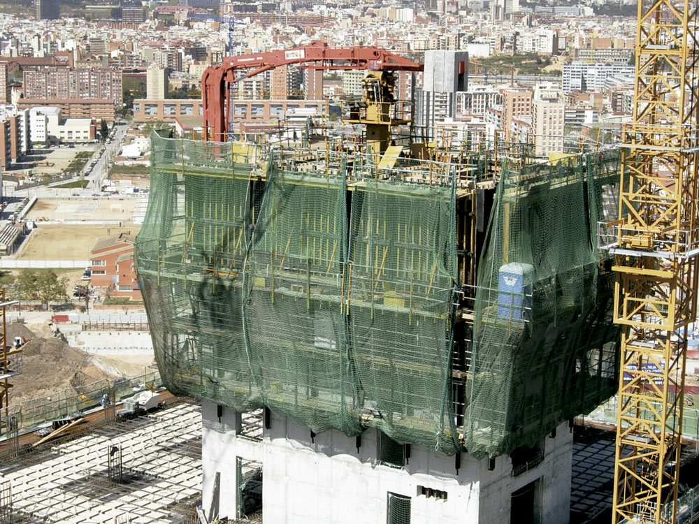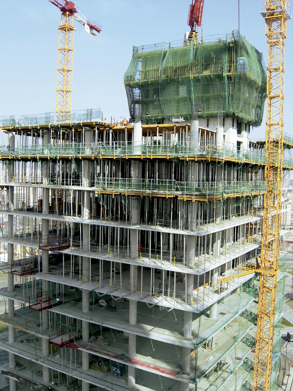 Así, en la ejecución de núcleos de concreto fue posible elevar el encofrado en condiciones climáticas adversas. La productividad o rentabilidad del sistema siempre estuvo asegurada ya que el ritmo de ejecución, en este caso, fue de una planta completa, de 700-1.300 m2, cada 6 ó 7 días. La técnica del autotrepado se basa en un sistema hidráulico que permite llevar a cabo la elevación del conjunto de manera automática y simultánea mediante el movimiento sucesivo del encofrado y los mástiles. Este sistema, utilizado junto con el ENKOFORM VMK, permitió la ejecución de muros con una altura típica entre losas de 3,84 m en el hotel y 4,14 m en el edificio de oficinas.