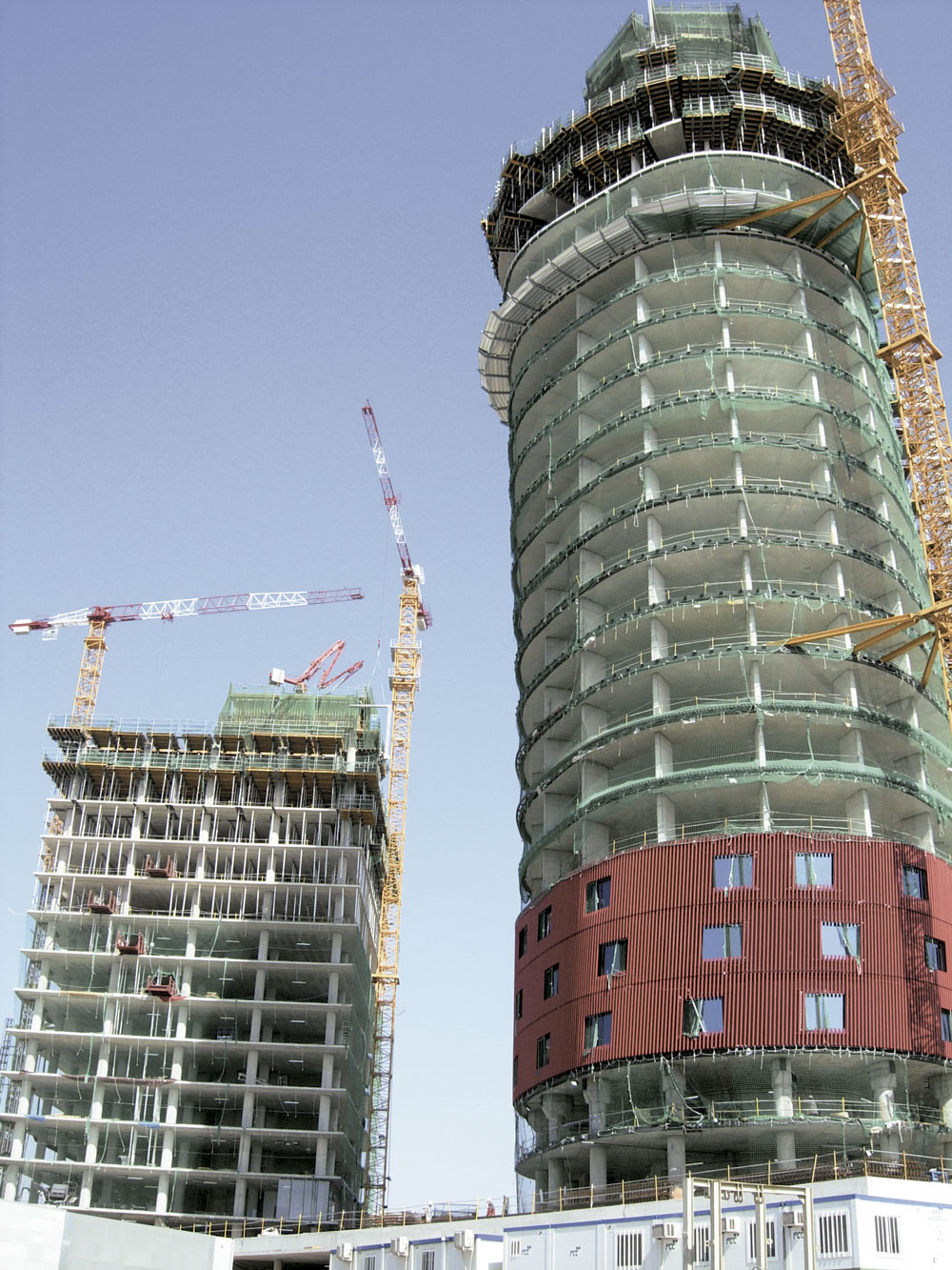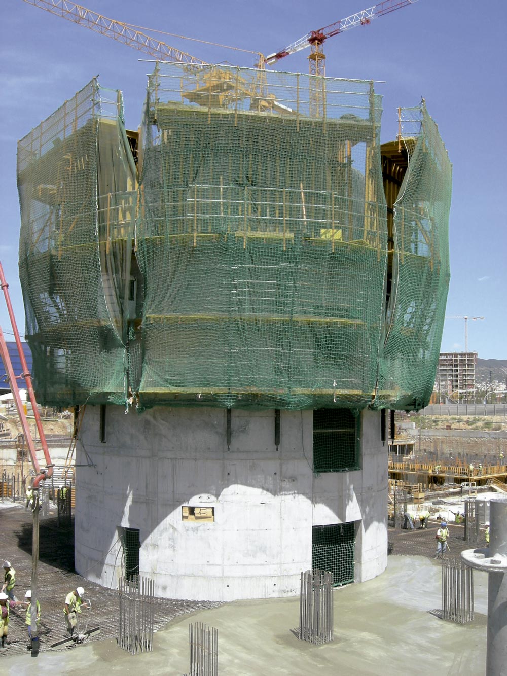 Las peculiares siluetas de ambos edificios precisaron de núcleos de concreto particulares. El núcleo del edificio del hotel, de geometría cilíndrica y un diámetro de 13 m y espesor de muro de 40 cm, se solucionó con una plataforma interior y consolas exteriores, ambas autotrepantes. Además, el efecto de rotación se consiguió con la variación de la superficie de una planta a otra, de 700 a 1.000 m2. Mientras que la geometría rectangular del edificio de oficinas, con un espesor de muro de 45 cm, se solucionó con tres plataformas interiores y consolas exteriores ambas autotrepantes.