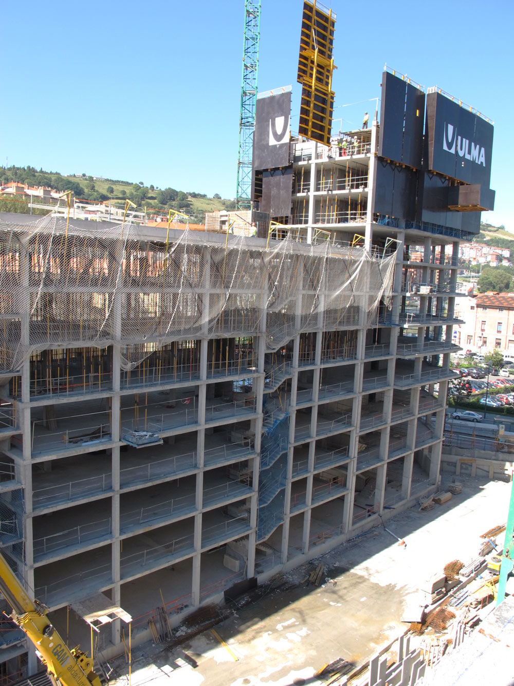 Los forjados de los edificios de losa maciza de espesores variables de 20 a 30 cm se han resuelto con el encofrado recuperable RAPID y puntales SP. Para la ejecución de las columnas y muros de los núcleos centrales de ascensores, escaleras y patinillos se ha utilizado el encofrado modular ORMA.