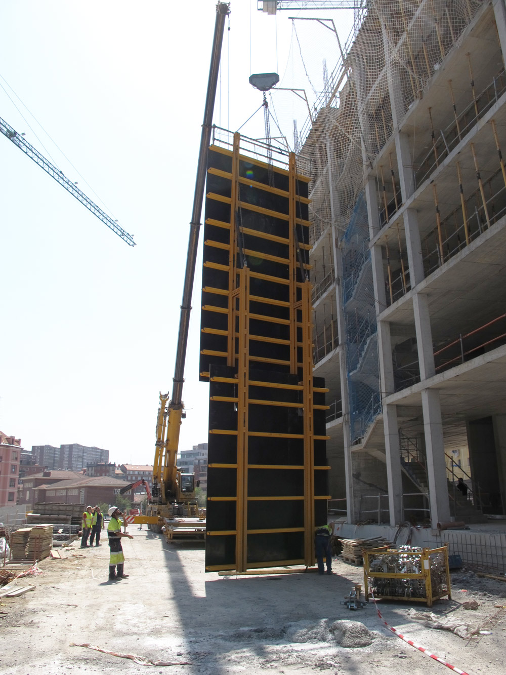 La protección perimetral HWS ha permitido trabajar con total seguridad y comodidad en la construcción de las estructuras de las torres con altos ritmos de trabajo, consiguiendo ejecutar 1 planta por semana y el trepado de todos los paneles de 1 torre se realizaba en menos de 6 horas de trabajo. Mientras en el piso superior se estaba montado el encofrado, en los 3 pisos inferiores se hacían labores de desencofrado. Para poder sacar el material desencofrado de las plantas inferiores se habilitaron en la parte inferior de 2 paneles de cada edificio, una plataforma de descarga de material de 3,9 m de voladizo.