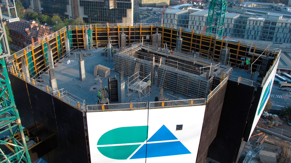 En los 3 rascacielos, se han empleado pantallas de protección perimetral HWS con cerramiento de tablero fenólico. Este sistema posee un mecanismo autotrepante mediante elevación hidráulica, que ha permitido liberar las grúas de obra para otras labores.