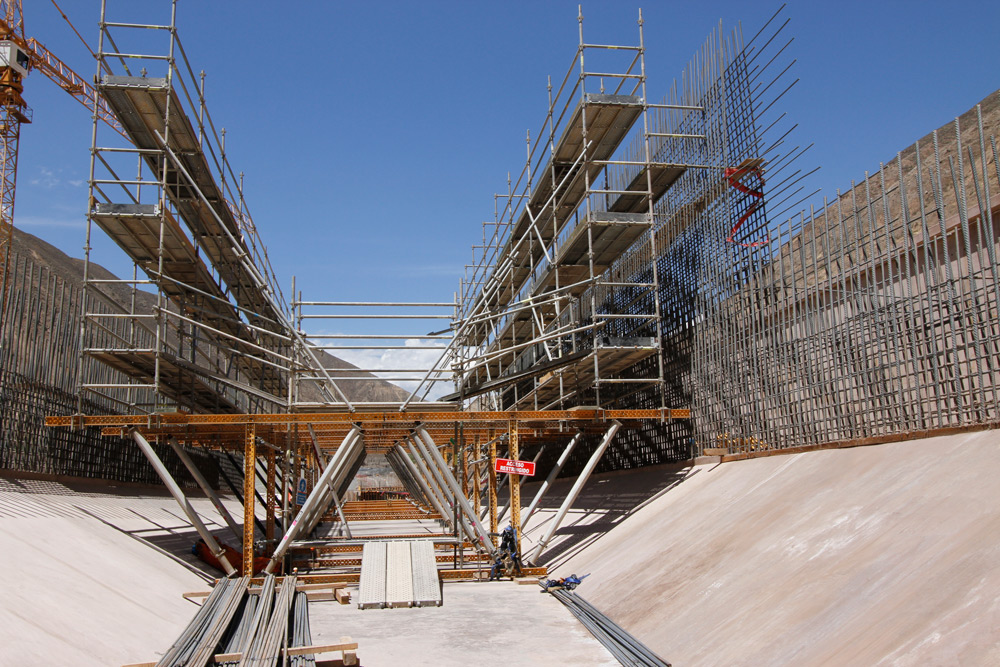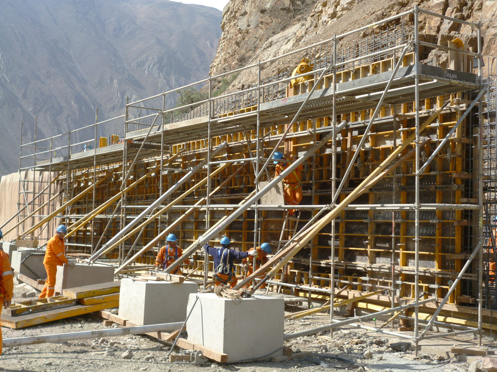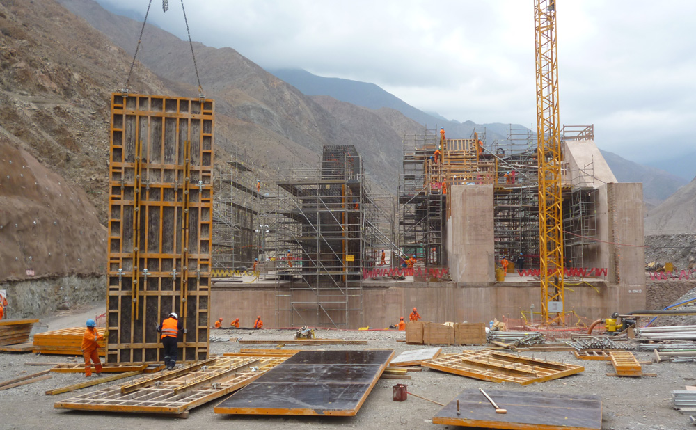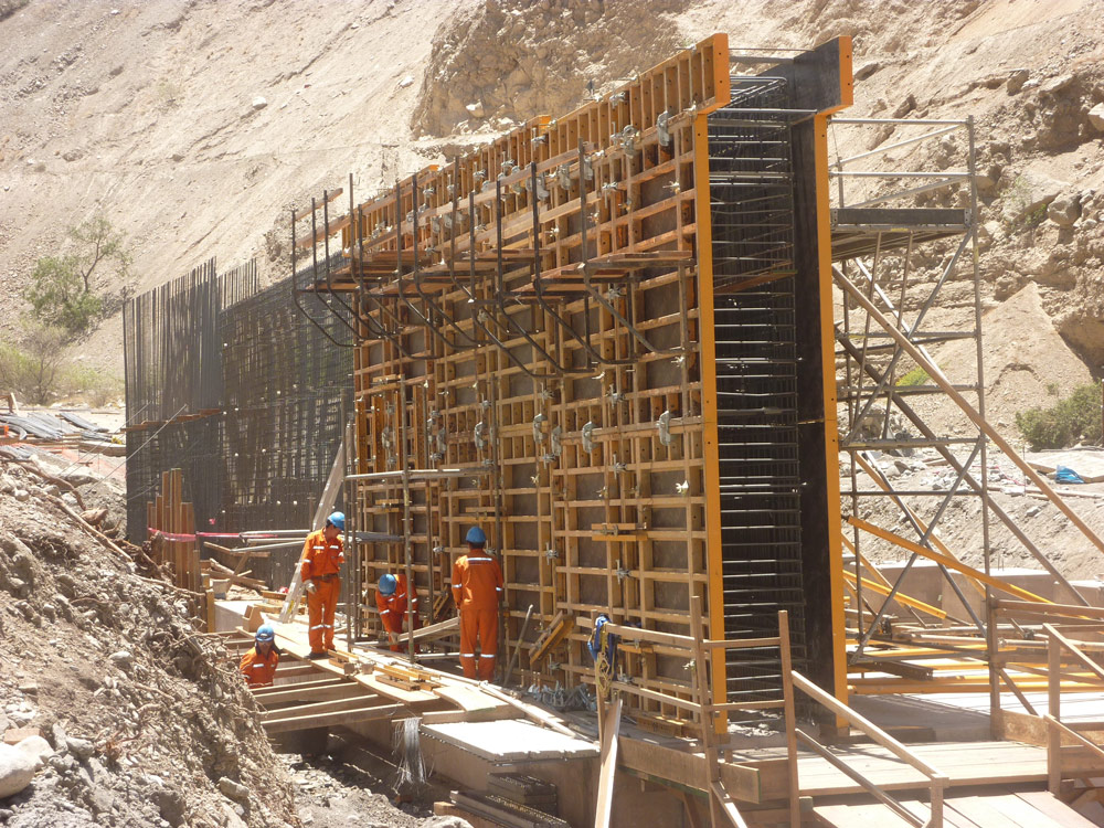 La edificación de la presa Checras, se inició con la construcción de la losa de regulación de fundación, que servirá como una base de la presa. Aquí se usaron los encofrados COMAIN, por la geometría del suelo y las soluciones versátiles que generaban al cliente. La primera estructura que se realizó en el sector fueron los muros de contención de 8 m de altura aproximada. El sistema que se utilizó fue el encofrado ORMA y andamios BRIO, para el armado del fierro y la plataforma de vaciado de concreto, mientras que para el cuerpo de la presa se empleó el sistema de encofrado COMAIN y las consolas BMK. Las etapas de vaciados oscilaban entre 2 a 3 m, empleándose en total 240 consolas BMK. Las presas también cuentan con losas que fueron encofradas con el sistema de apuntalamiento BRIO. Asimismo, el túnel ubicado en la parte superior de la presa se resolvió de igual forma con muros del sistema COMAIN, mientras que para losas se usó la cimbra BRIO. Adyacente a la presa se encuentra el intake, con muros alrededor de 5 metros, y losas de espesor de 1 m. Debido a la curvatura de muros, se propuso el sistema ENKOFORM y la losa se trabajó con el sistema de cimbra BRIO. Para la presa Huaura se empezó con los muros de contención, debido a las juntas horizontales, realizándose en dos etapas de vaciado de aproximadamente 5 m de altura para lo cual se empleó el encofrado ORMA, mientras que para el trepado se empleó las consolas BMK.