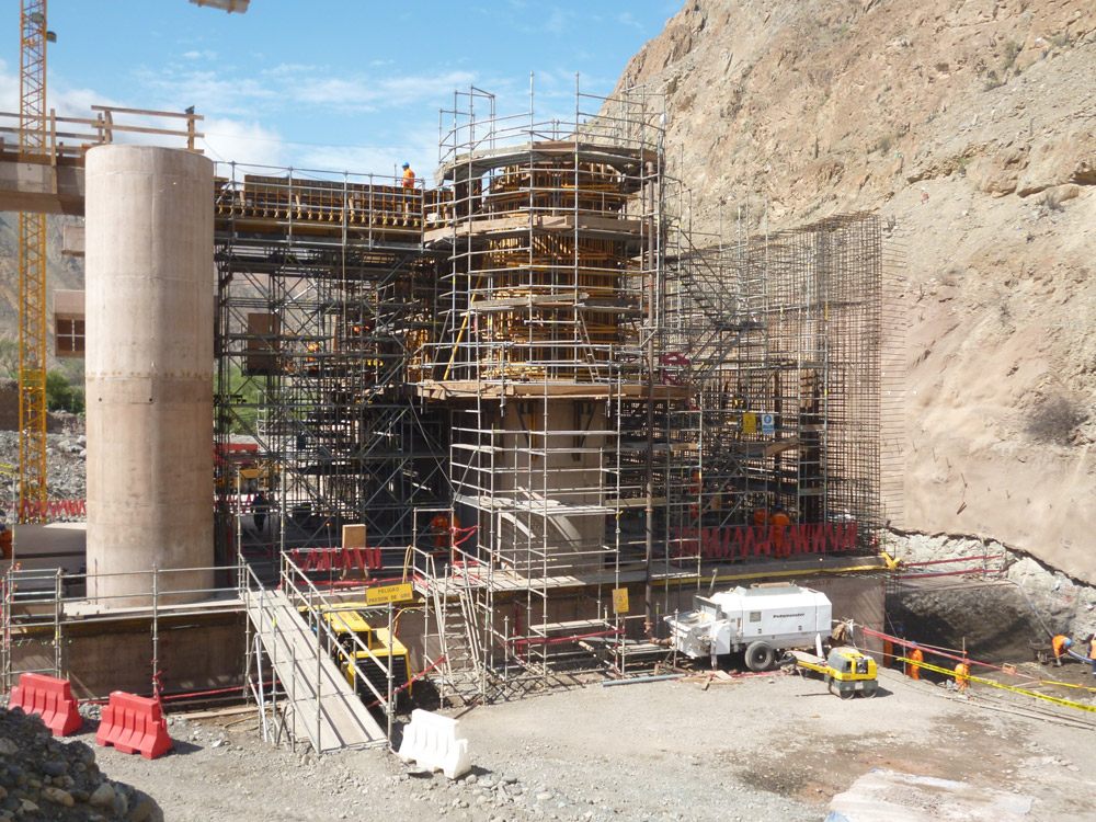 En esta parte de la obra se empleó el sistema COMAIN, desde la cimentación hasta el cuerpo. En los accesos se trabajó con el sistema de escaleras BRIO al igual que para el armado del acero, mientras que para el intake se laboró íntegramente con el sistema COMAIN para muros y las losas con la cimbra BRIO. Para realizar la presa Picunche, se ejecutaron trabajos con las cimentaciones de muros de contención y de la presa empleando el sistema ORMA y puntales EP y ALUPROP, debido a que el encofrado fue a una cara. En este sector para los muros se empleó el sistema ORMA y consolas BMK, debido a que tienen alturas de 10 m. Para el armado del fierro se empleó el sistema BRIO. Entre muro y muro, existe una pasarela o losa de 80 cm de espesor, la cual fue encofrada con el sistema de cimbra BRIO. Asimismo, se utilizaron escaleras de acceso, que se hicieron para que el personal pueda subir al nivel de losa de forma segura y rápida.