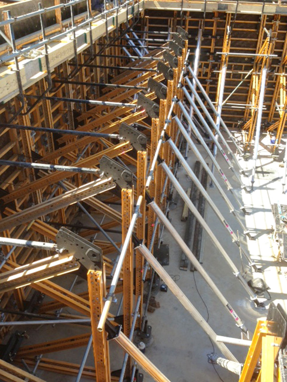 De ahí que se haya planteado una solución específica; para incrementar la velocidad de hormigonado se ha reforzado la estructura con puntal de aluminio ALUPROP. Las ventajas de este puntal de gran capacidad de carga junto con un elemento específico fabricado para este proyecto han permitido el apoyo necesario y la distribución de cargas adecuada. Esta aplicación con puntales ALUPROP en la parte trasera de los marcos se ha realizado por primera vez y con gran éxito ya que ha evitado que el cliente tuviese que rediseñar por completo las losas inferiores.