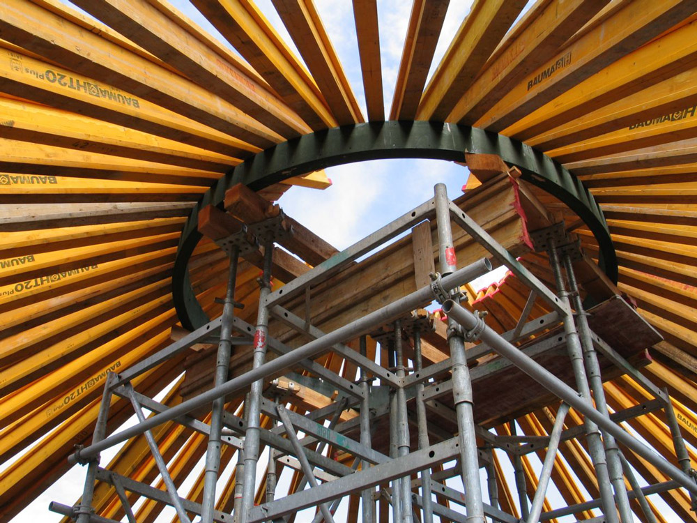 La estructura de la cubierta se estableció sobre una plataforma intermedia a 12 m de altura construida con el encofrado de vigas. El sistema de apoyo de la plataforma consistió en 50 torres de cimbra, arriostradas entre sí, y de alturas diferentes, debido a la forma cónica de la fosa.