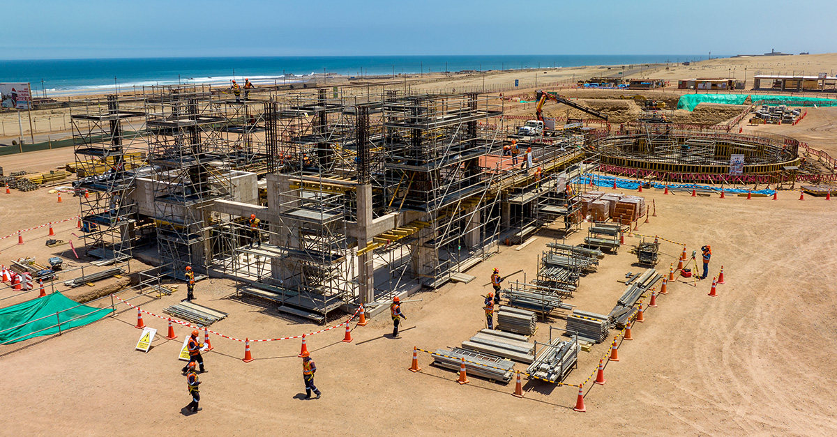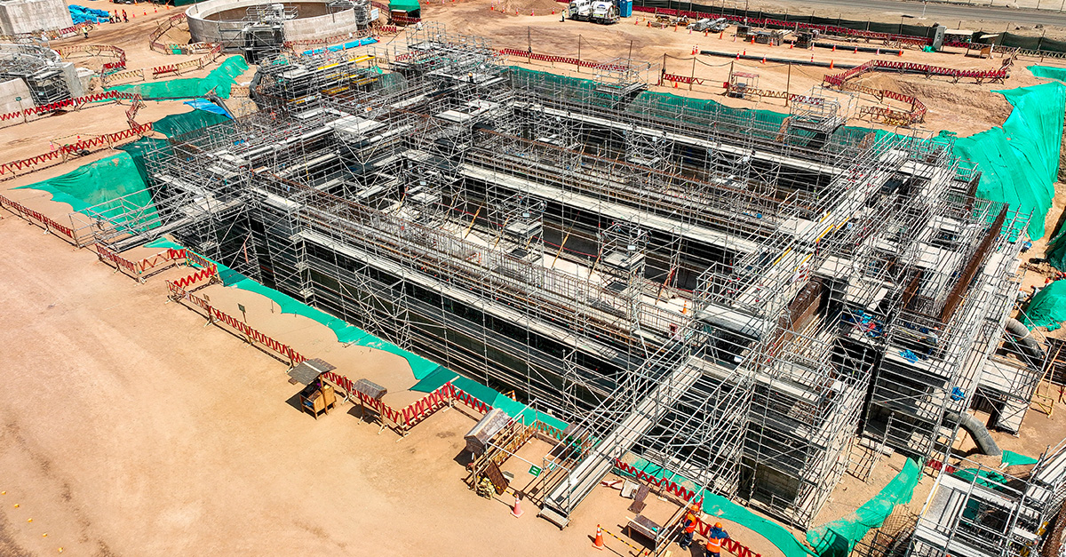 Para la línea de agua de pretratamiento, se construyó un edificio de 393 m² de área techada, con una altura de soporte de vigas y losa de 8.76 m. Para su cimentación, se utilizaron encofrados a una cara con el sistema Comain. Para los elementos verticales y horizontales se emplearon también los encofrados Comain, y los andamios multidireccionales BRIO para proporcionar accesos seguros al personal.