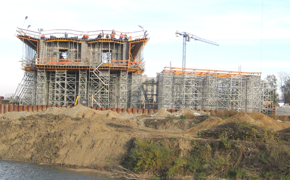 El encofrado de fondo del tablero se ejecutó con el Sistema MK cubierto con tablero contrachapado. MK soluciona este y muchos otros tipos de aplicaciones con el empleo de material estándar. Para el encofrado de alas se utilizó ENKOFORM H-120, encofrado de forma con vigas de madera.
