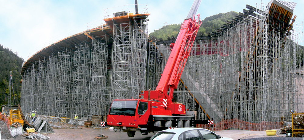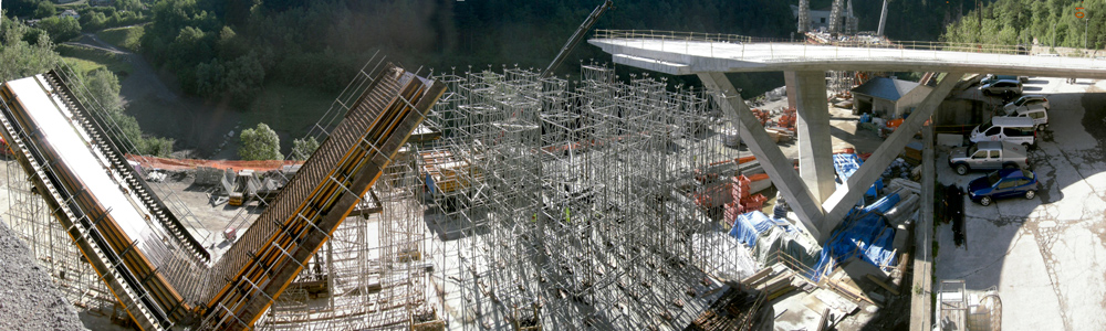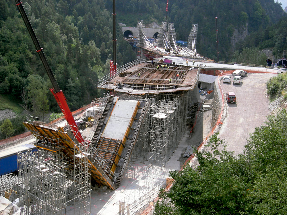 En la ejecución de los tableros, de más de 250 metros, se empleó la solución más eficaz constituida por el sistema de Encofrado ENKOFORM HMK apuntalado con cimbra. En aquellos casos en los que fue necesario cubrir pasos de 28 m de luz, se emplearon Estructuras H-33 combinadas con torres modulares de T-500. Para adaptarse a las distintas secciones de tablero se utilizaron dos riostras, con la forma de la sección del puente, apoyadas sobre los cabezales de la cimbra. Las riostras soportaron a su vez las vigas que determinaban las medidas de cada paño. Con este sistema de unión se asegura la estabilidad del conjunto en la fase de trabajo y durante el cambio de encofrado. Estos paños se desencofraron mediante trácteles colocados sobre el tablero, así fue posible trasladarlo a la siguiente posición, sin ser desmontado. La mano de obra necesaria para su montaje y desmontaje es menor que con otros sistemas, sobre todo cuando se producen varias puestas, como en este caso, con varios puentes iguales o viaductos de gran longitud.