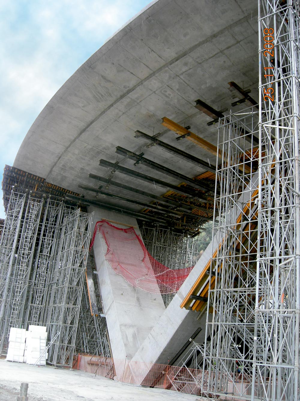 La columna ejecutada, en el nudo de las tres estructuras, se planteó como un trípode sobre un plinto. Las palas de distintas longitudes, de 3,5 m de anchura y una sección variable, se realizaron con los mismos productos que en el tablero del viaducto, rentabilizando así las distintas fases de obra. Los paños, de aproximadamente 4 m, se constituyeron con encofrado de fondo (ENKOFORM HMK), dos laterales y uno de tapa, permitiendo así el desmontaje por partes y un perfecto acabado cara vista. El soporte se estableció con cuatro vigas de apoyo DU-120 sobre una serie de torres de cimbra. Estos soportes ligeros, de fácil montaje y manipulado, se transportaron con grúa ya que disponen de ensamblajes de bloqueo automático. Así estas torres premontadas agilizaron la labor de los operarios y ahorraron costos y tiempos de trabajo.