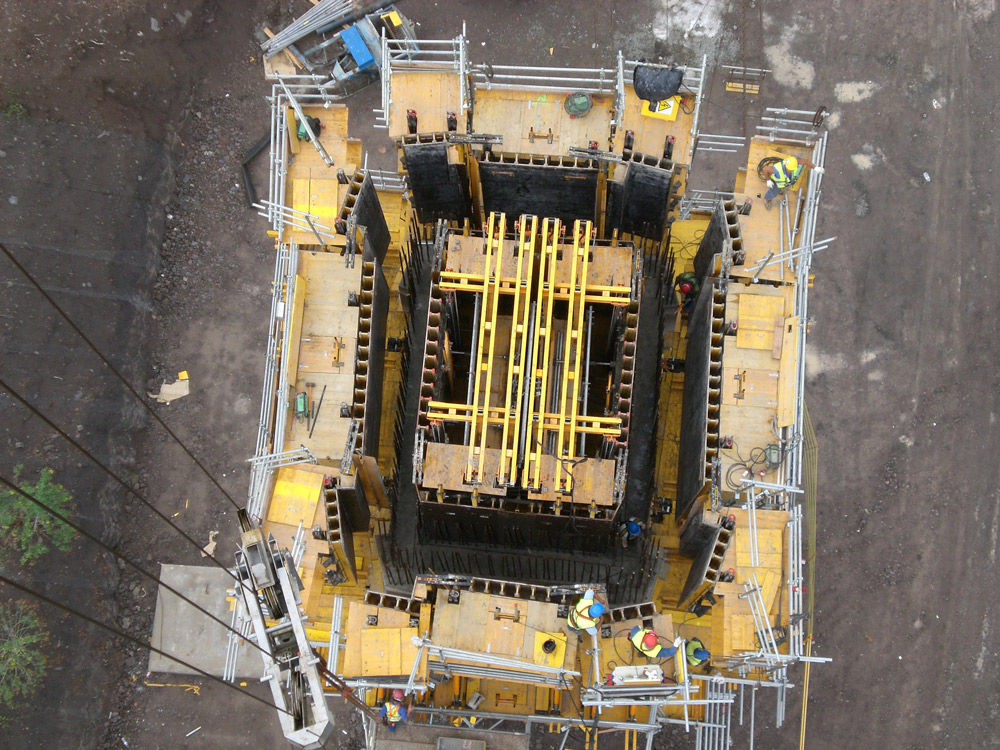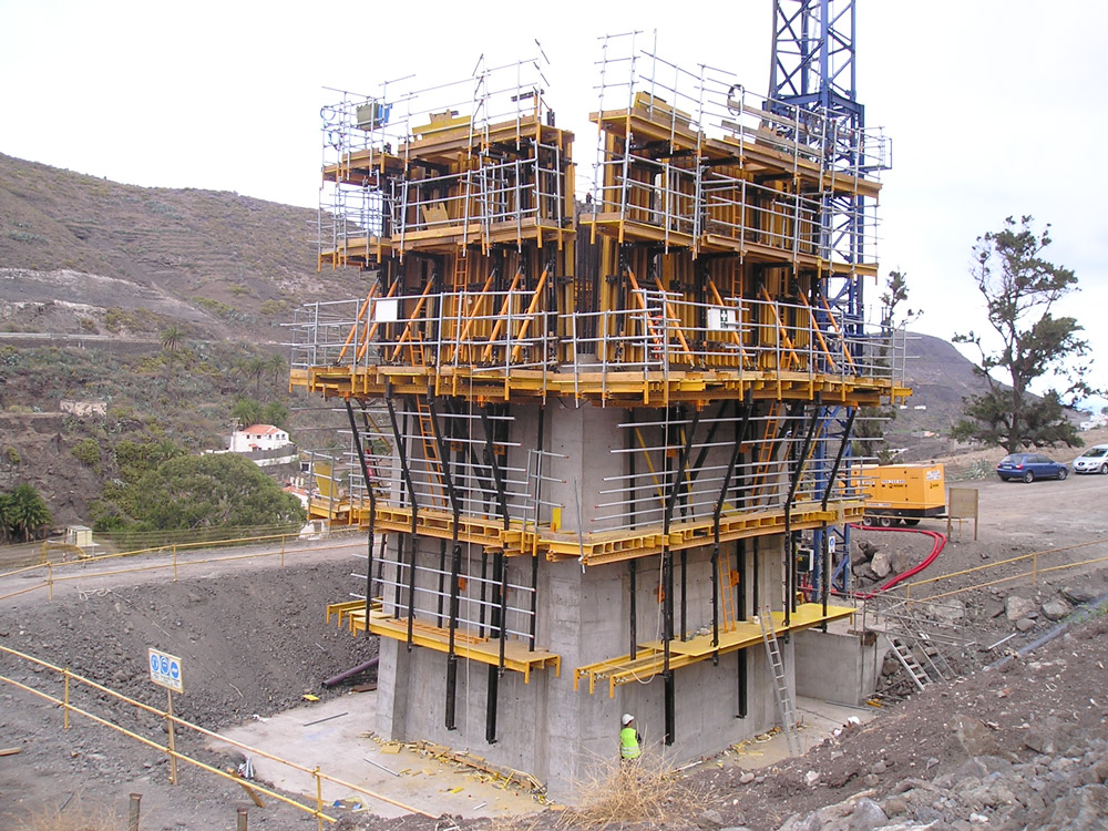 Las columnas 2 y 3, de sección variable, se ejecutaron con el sistema autotrepante ATR, lo que exigió la adaptación de éste y del encofrado a cada tongada.