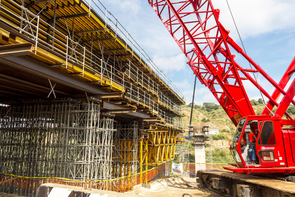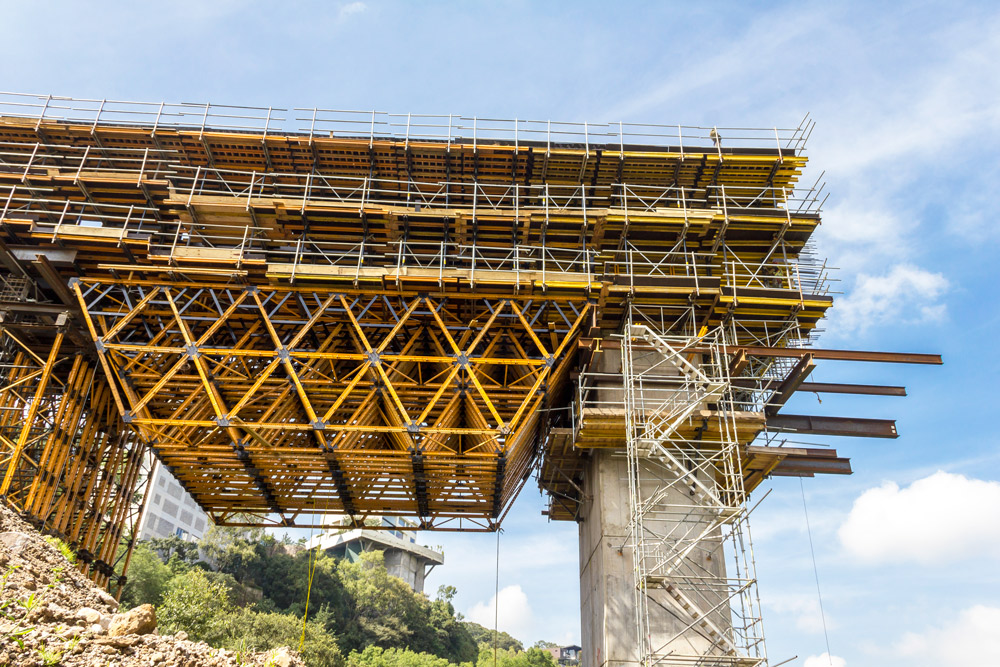 Las columnas rectangulares huecas con chaflán interior, se ejecutan mediante ENKOFORM V-100 y Consolas CR-250 con altura de paños de 5m. Una vez ejecutadas las columnas se monta la cimbra porticada con Cimbra OC y perfilería los tres primeros pórticos, y con Cimbra MK y Cercha MK el pórtico 4 del vano ESTRIBO 1 – columna 2.