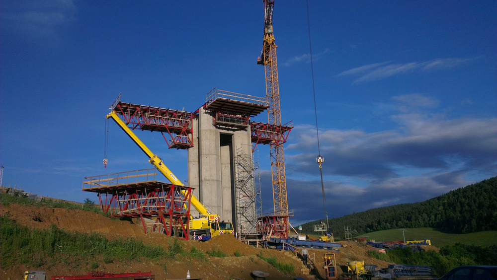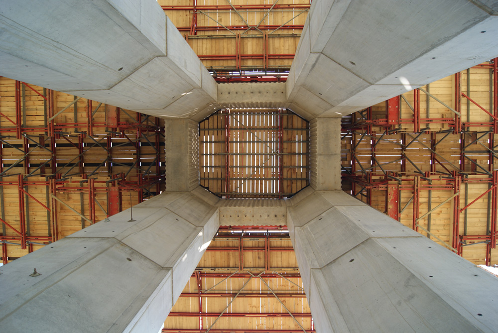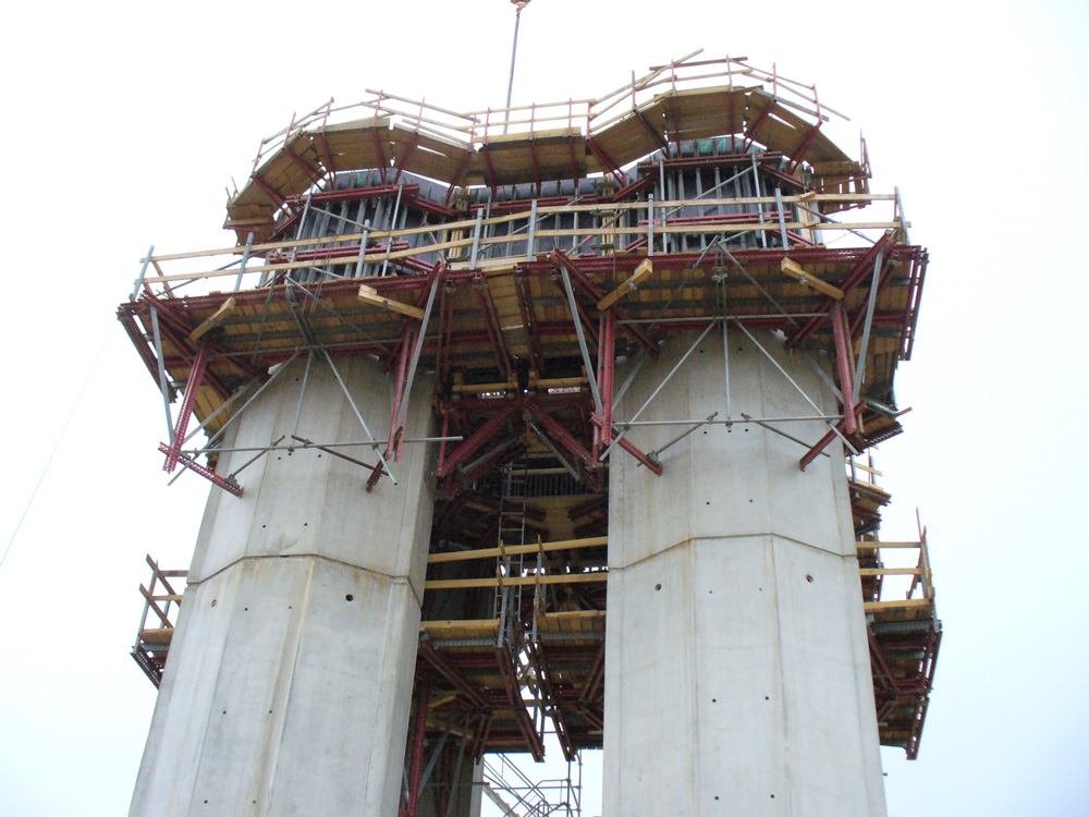 Tanto las columnas, los estribos, como la dovela cero se han construido con encofrado modular basado en la tecnología de MK. Como estructura de soporte para realizar el muro de refuerzo se han planteado las consolas de gran carga MK que, al igual que el sistema de trepado, se han adaptado a la forma de las columnas.
