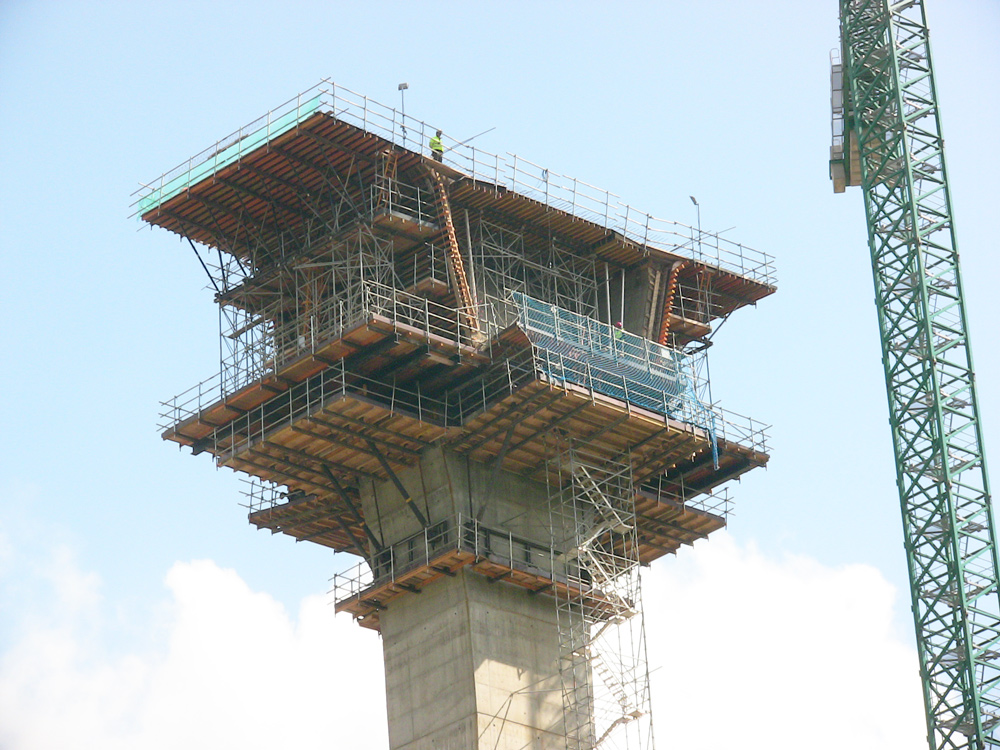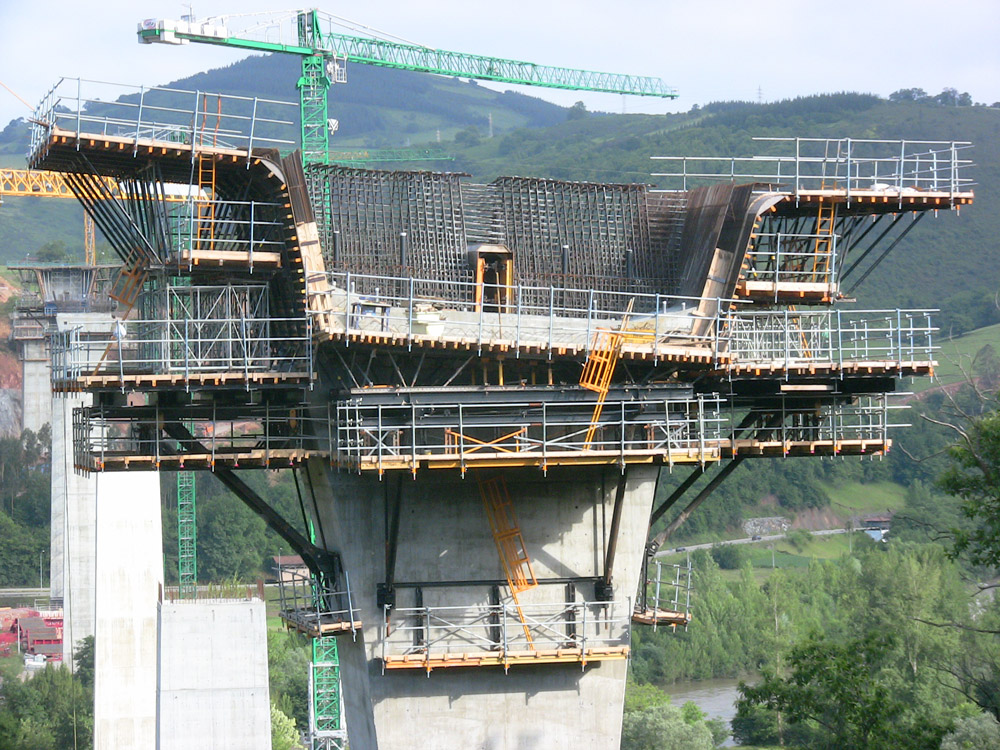 La cabeza de columna o dovela 0 se ejecutó sobre la Consola G, mediante el encofrado ENKOFORM HMK. Algunos hastiales de 9 m de altura se hormigonaron en dos fases.