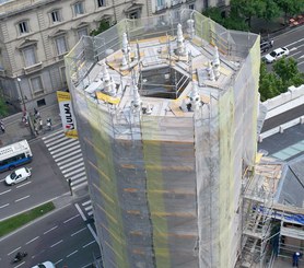 Acceder a las caras laterales de los torreones y evitar el montaje desde el suelo, requería de un andamio con vuelos. El Andamio Multidireccional BRIO lo permitió. En las caras cuyo montaje se realizaba desde el suelo, se empleó el andamio DORPA, idóneo en trabajos de fachada. Para minimizar el impacto en la vía pública se instaló el andamio BRIO, que permitió habilitar pasos peatonales.