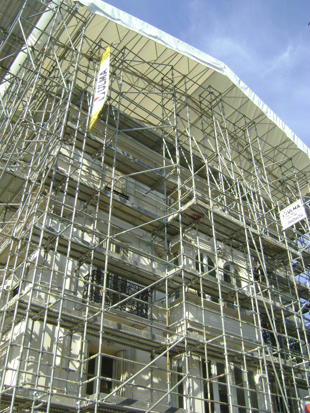 Ante las numerosas operaciones con grúa para suministrar material durante todo el proceso, ULMA optó por dos cubiertas temporales rodantes que permiten la apertura y cierre de la cubierta. Además de esta cubierta, la versatilidad del Andamio Multidireccional BRIO posibilitó el revestimiento total del edificio, salvando su compleja geometría. Se crearon plataformas de trabajo a diferentes niveles y se permitió el paso seguro de peatones por la vía pública.