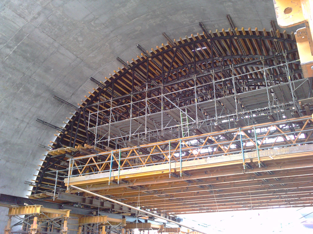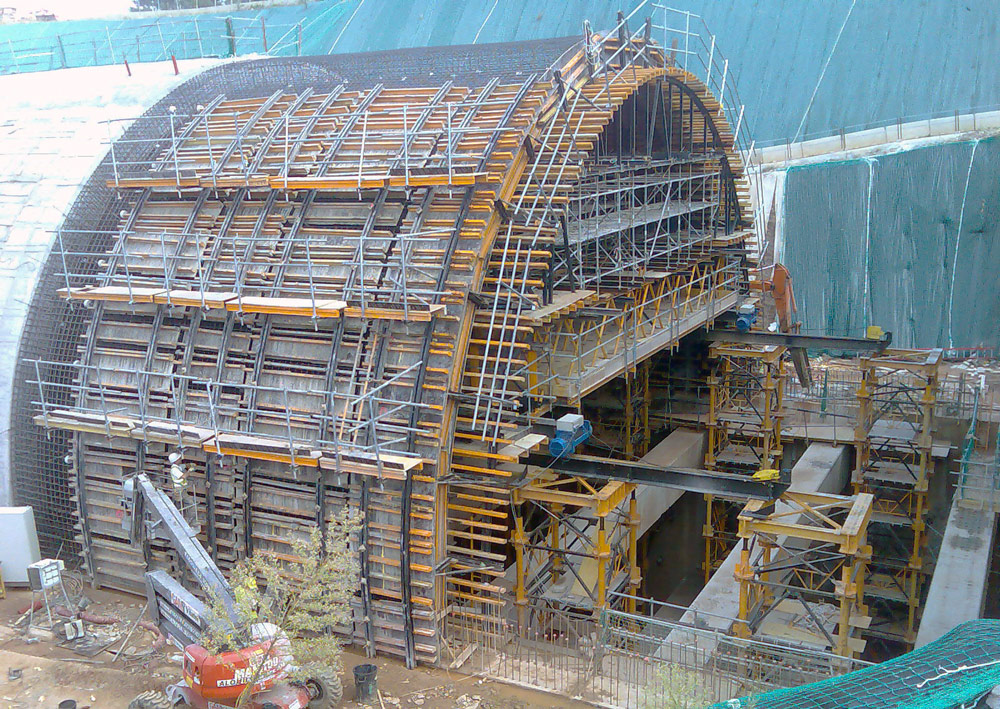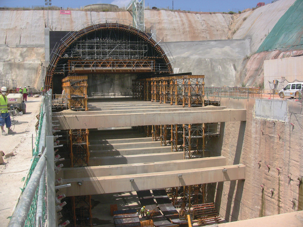 El carro, de 14 m de longitud y 22 m de diámetro de bóveda, cubrió una longitud de 130 m en etapas de vaciado sucesivas de 12,35 m.