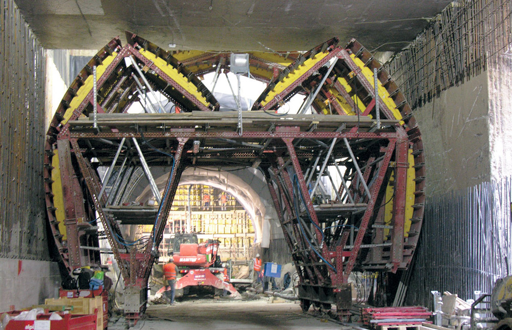 - Ciclo de hormigonado: 2 días. Con el Sistema MK, como cercha con encofrado de forma, se ejecutaron muros de hasta 12 m de longitud. Ideal para largas estructuras, proporcionó una amplia gama de secciones en túneles, al margen de formas y cargas.