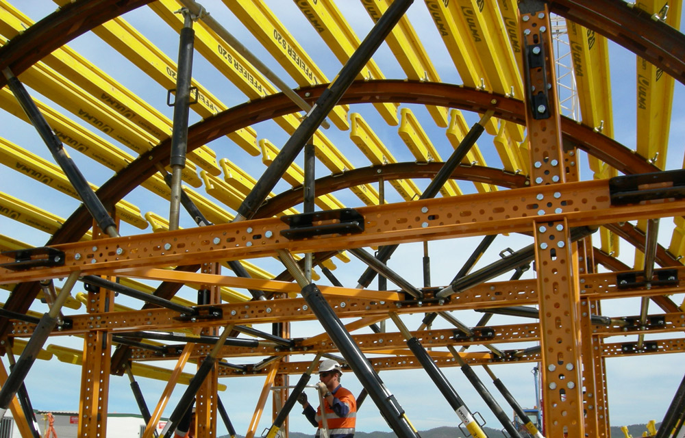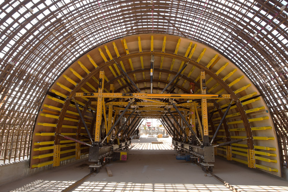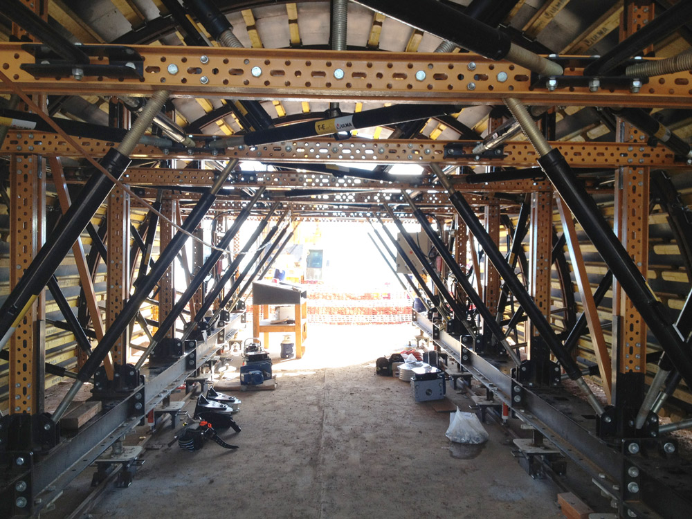 Para satisfacer estas necesidades se emplearon Carros de túnel MK. Las conexiones entre riostras del Sistema MK proporcionan gran rigidez y exigen menos material. Además, facilitan la colocación de mayores plataformas de concreto que las usuales.
