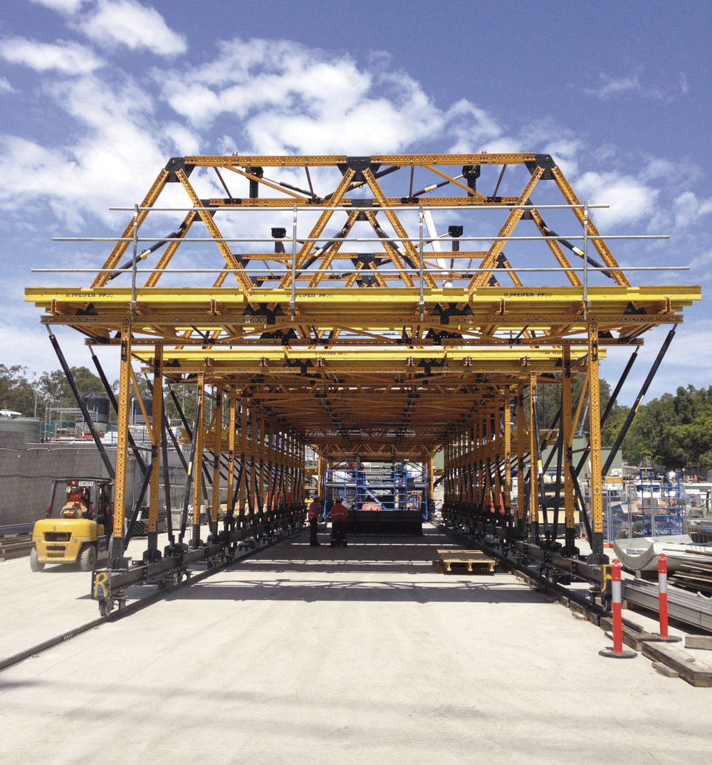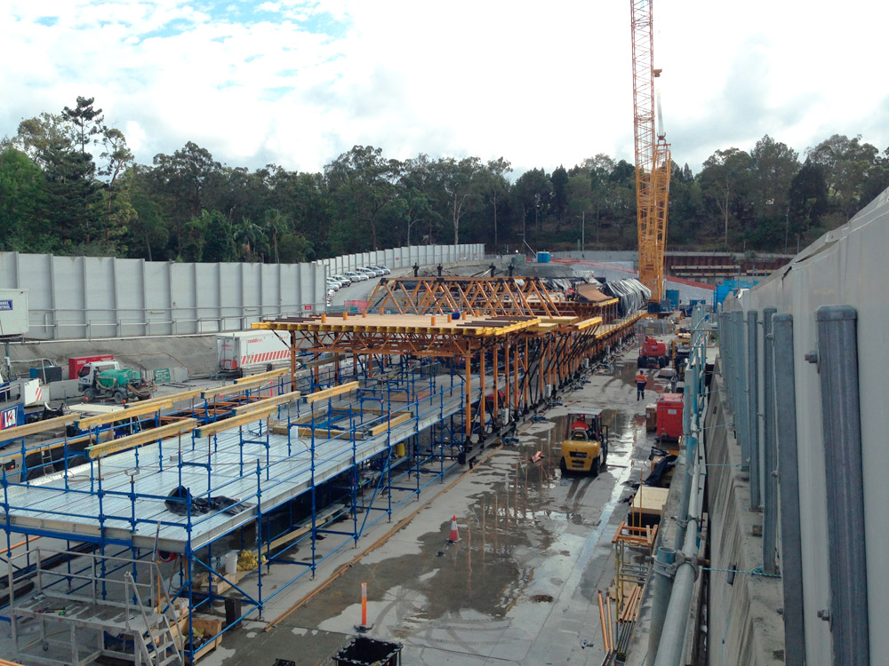 Una vez colocados los muros prefabricados de concreto, el siguiente paso era el establecimiento/disposición de los equipos eléctricos y mecánicos. Transcity, constructor del proyecto, buscaba una solución innovadora para instalar los voladizos y conductos de ventilación en los túneles. Uni-span, distribuidor oficial de ULMA en Australia, fue elegido desde el inicio del proyecto para la planificación, suministro y construcción de este trabajo en ambos túneles.