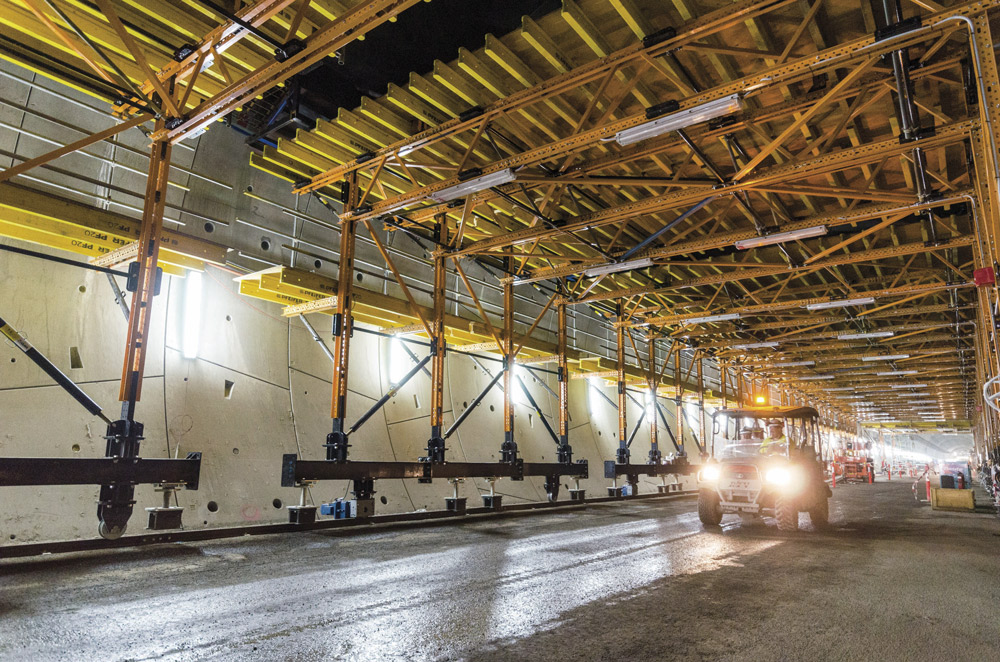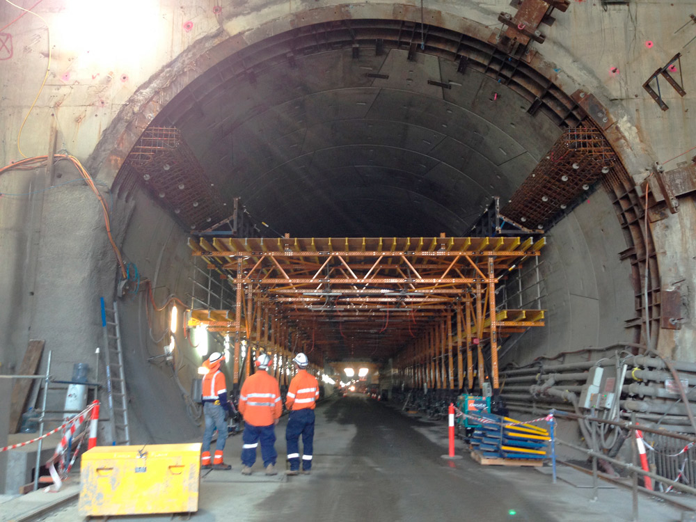 Por primera vez en un túnel de Australia, las losas pretensadas de concreto prefabricado se han apoyado únicamente sobre un voladizo de concreto in situ. Este montaje supuso un gran reto en términos de logística, geometría, espacio y seguridad. Además el voladizo tenía unas tolerancias mínimas para lograr el cierre hermético de los conductos.