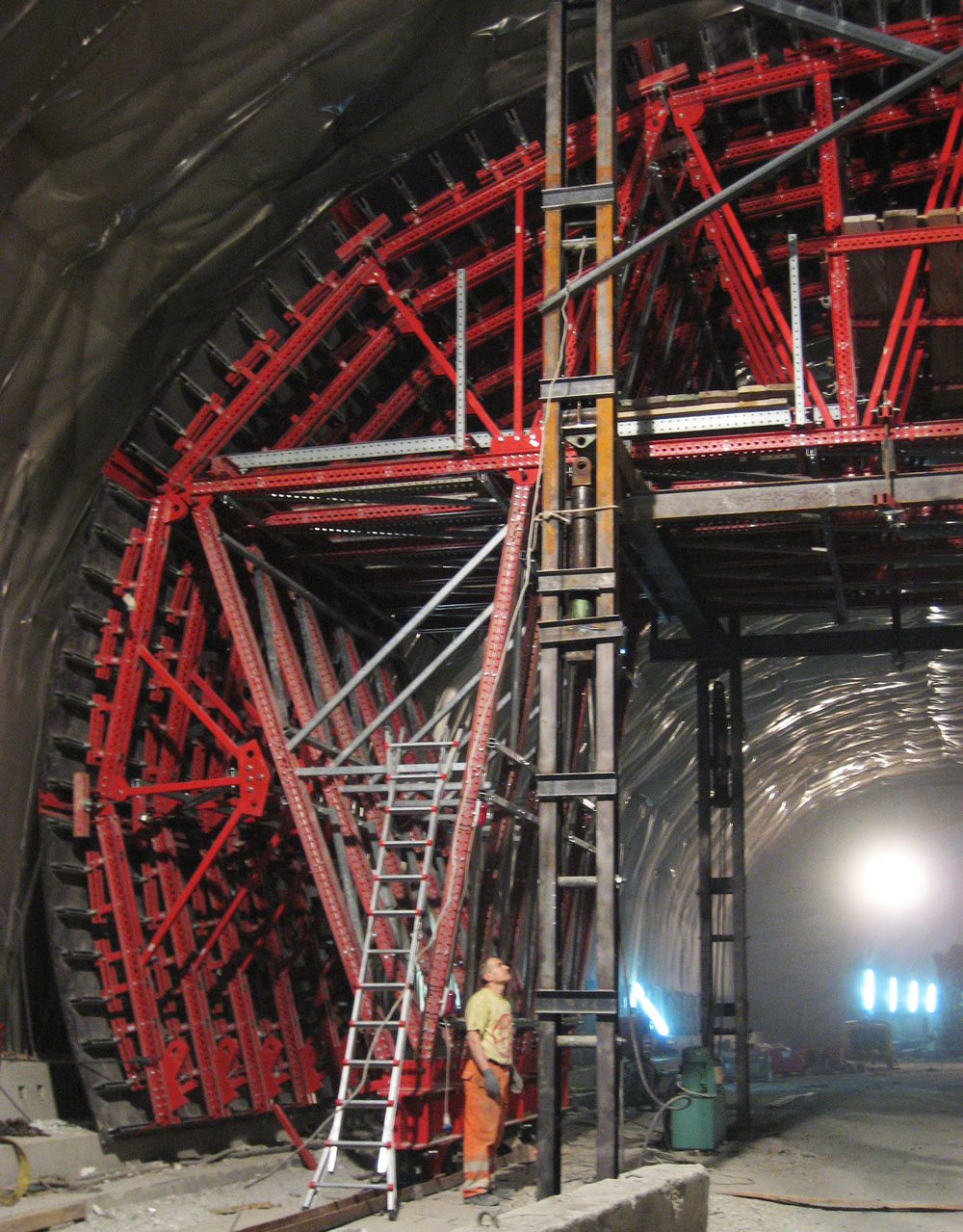 El carro de encofrado utilizado para ejecutar las galerías del túnel, de 15,7 m de ancho, 6,2 m de largo y 9 m de altura estaba compuesto por piezas estándares. El proceso de encofrado y los movimientos de estructuras en el interior del túnel se realizaron con gatos hidráulicos controlados desde la unidad central. Este sistema permitió el traslado de 28 t de Estructuras MK con total facilidad. El carro de encofrado completó la ejecución de la bóveda cuya elevación se efectuó con unidades hidráulicas.
